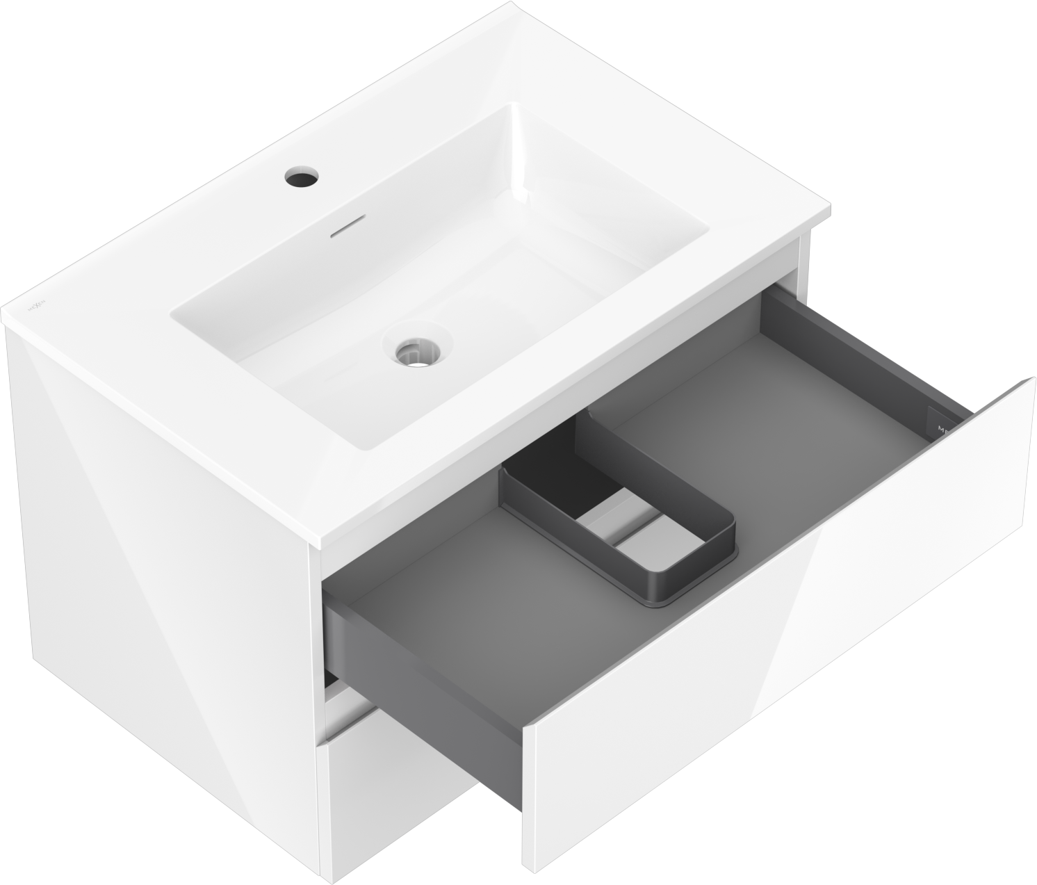 Laatikon leikkaus on suunniteltu siten, että se mahtuu vetolaitteeseen, joka on välttämätön pesuallasasennuksissa. Tämän ansiosta huonekalu voidaan asentaa täysin toimivasti, luopumatta laatikon tilasta asennusten hyväksi.