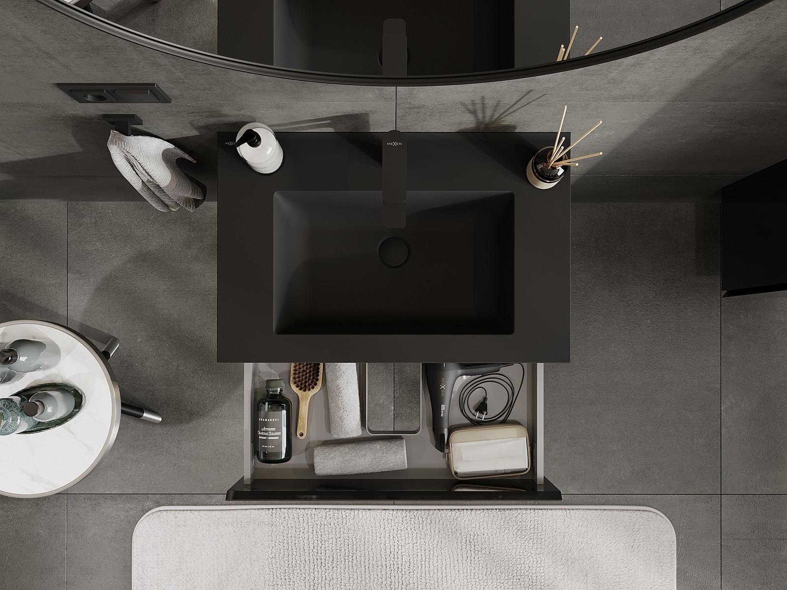Mexen Orio 70 cm kylpyhuonekaappi, jossa on pesuallas Otis, 2 laatikkoa, musta kiiltävä/musta mattapinta