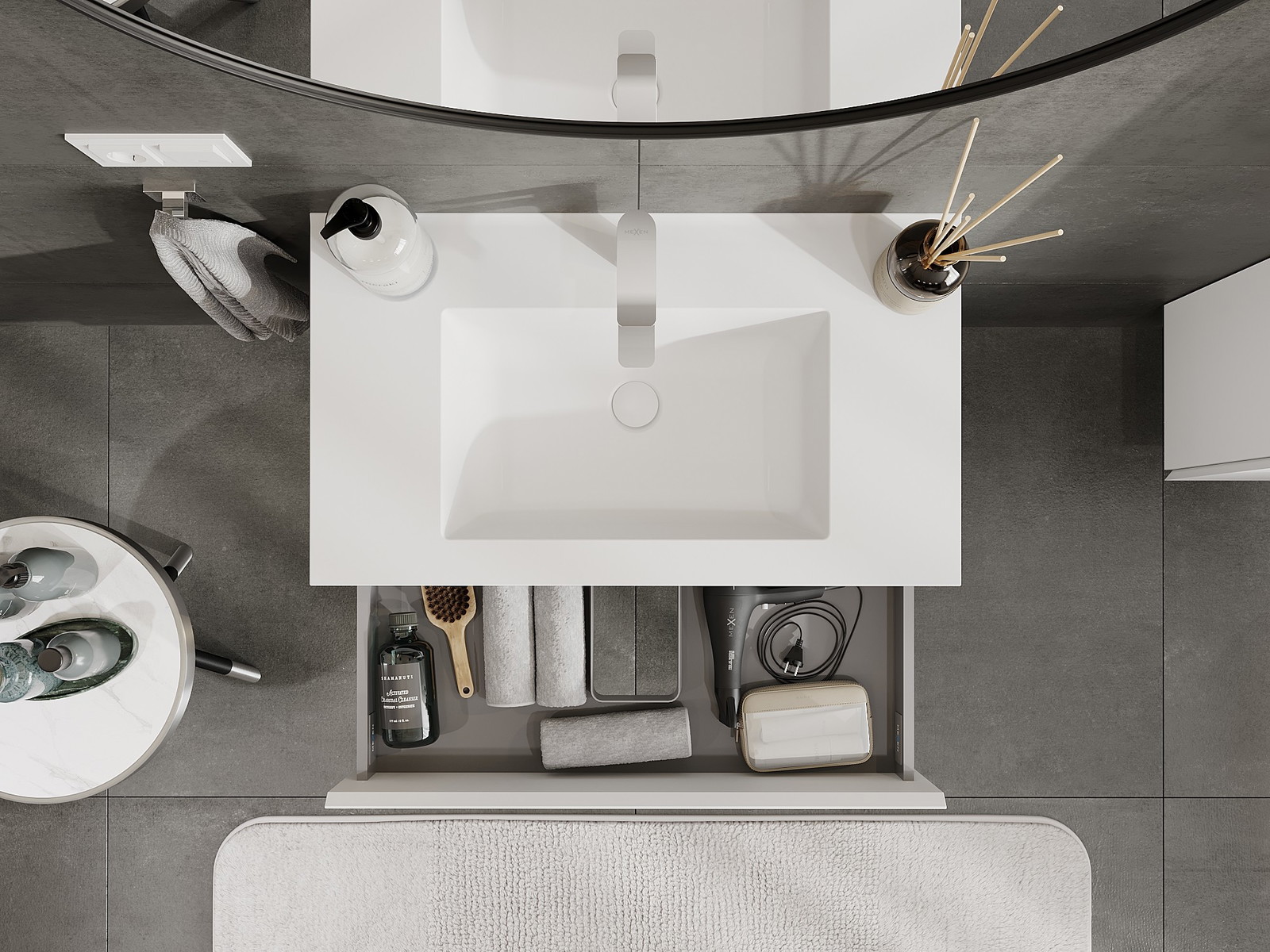 Laatikon leikkaus on suunniteltu siten, että se mahtuu vetolaitteeseen, joka on välttämätön pesuallasasennuksissa. Tämän ansiosta huonekalu voidaan asentaa täysin toimivasti, luopumatta laatikon tilasta asennusten hyväksi.
