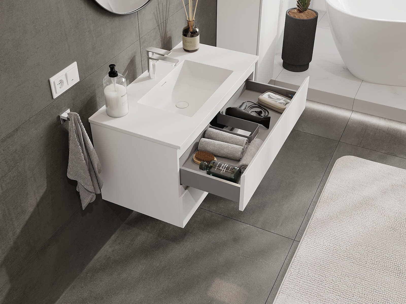 Modulaariset kylpyhuonekalusteemme voidaan yhdistää eri väriyhdistelminä, mikä mahdollistaa täydellisen personoinnin. Voit valita sekä ulkonäön että yksittäisten elementtien toiminnot, mikä mahdollistaa huonekalujen mukauttamisen omien tyylillisten ja käyttöön liittyvien mieltymysten mukaan.