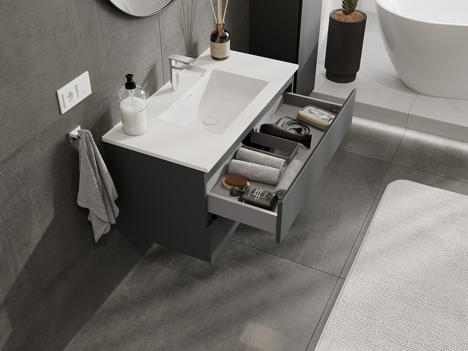Mexen Orio kylpyhuonekaappi 90 cm altaalla Otis, 2 laatikkoa, grafiitinmatta/valkoinen matta - 91A10-09047-2-BFF66-W18M01