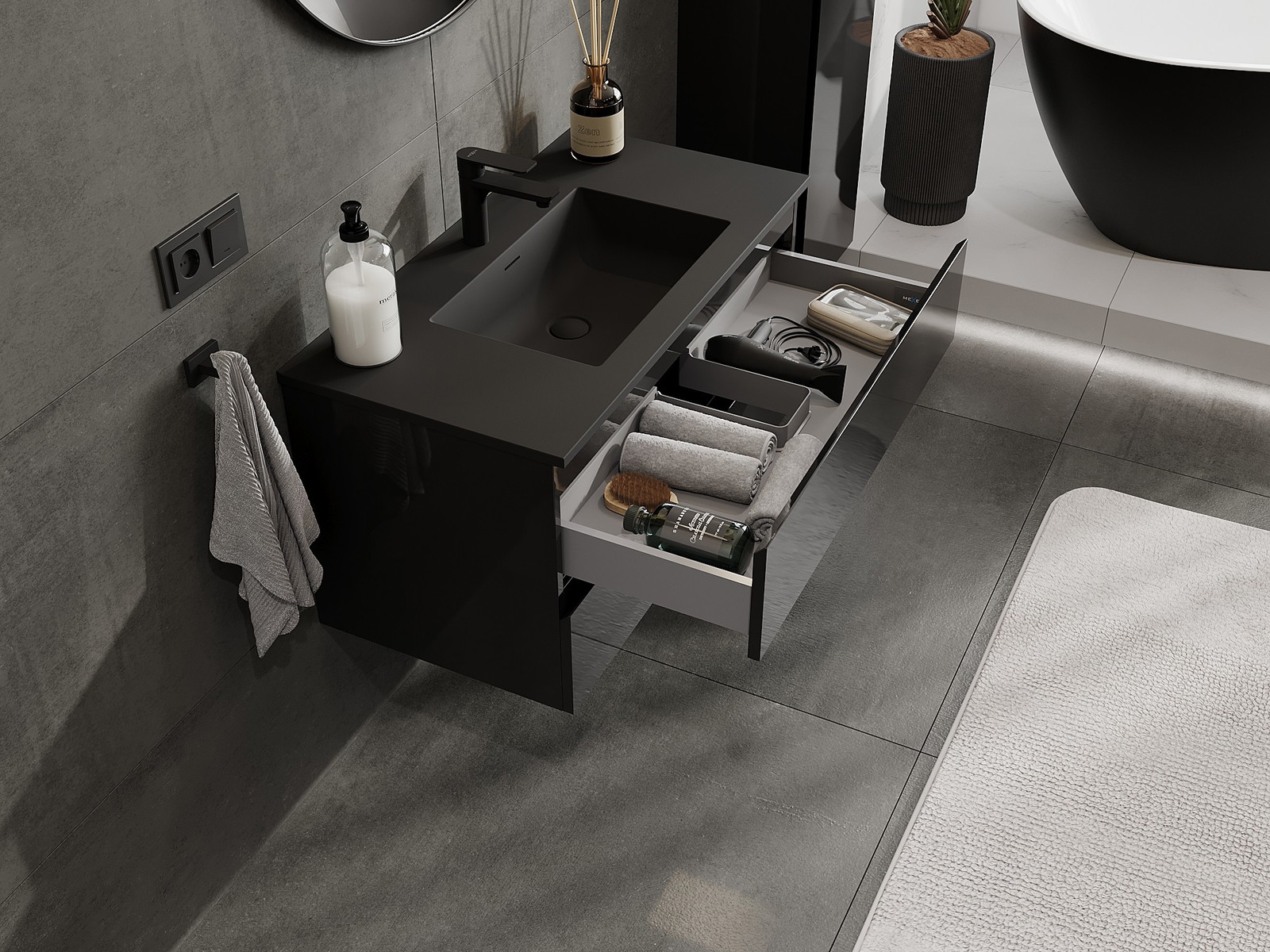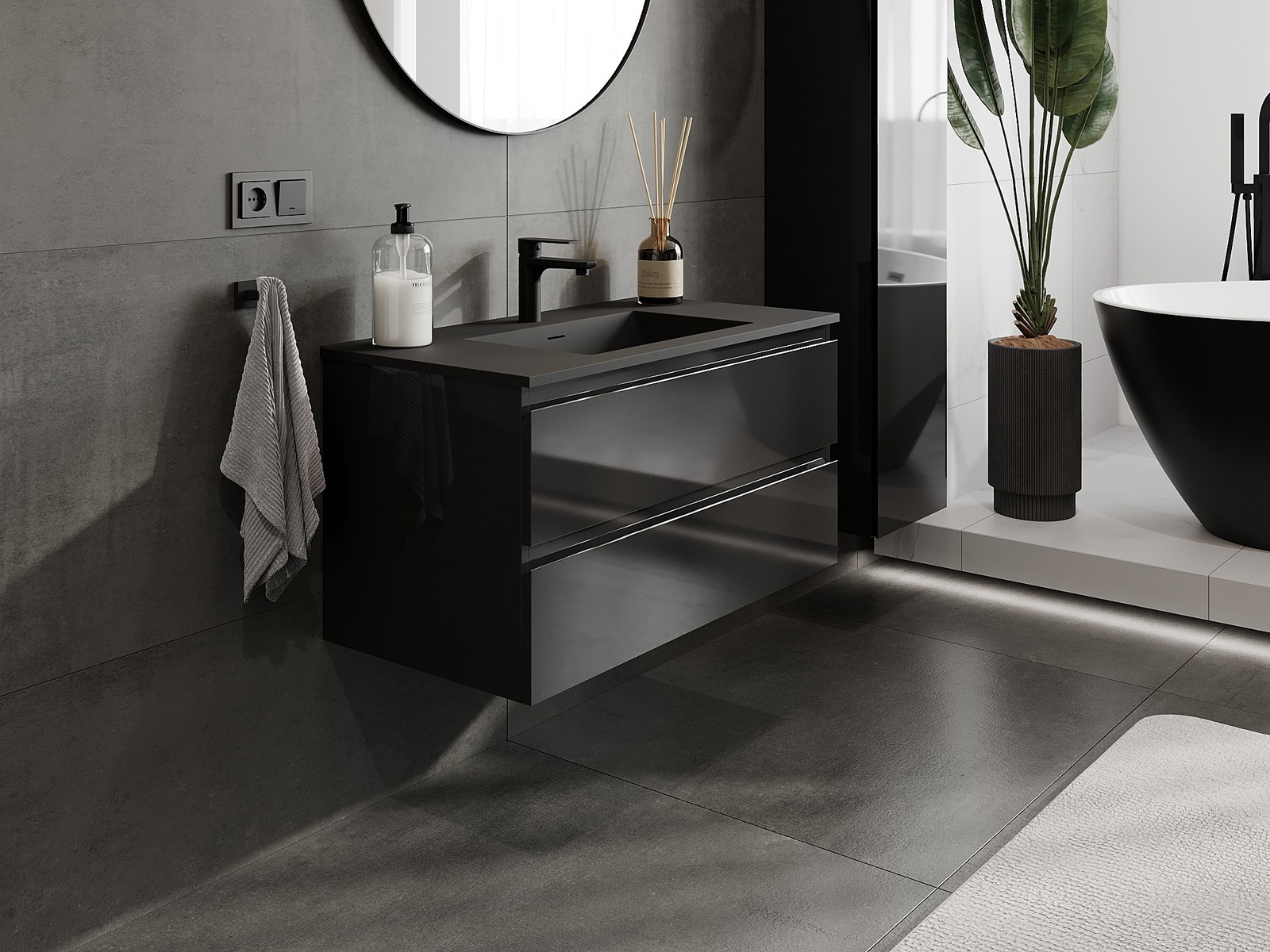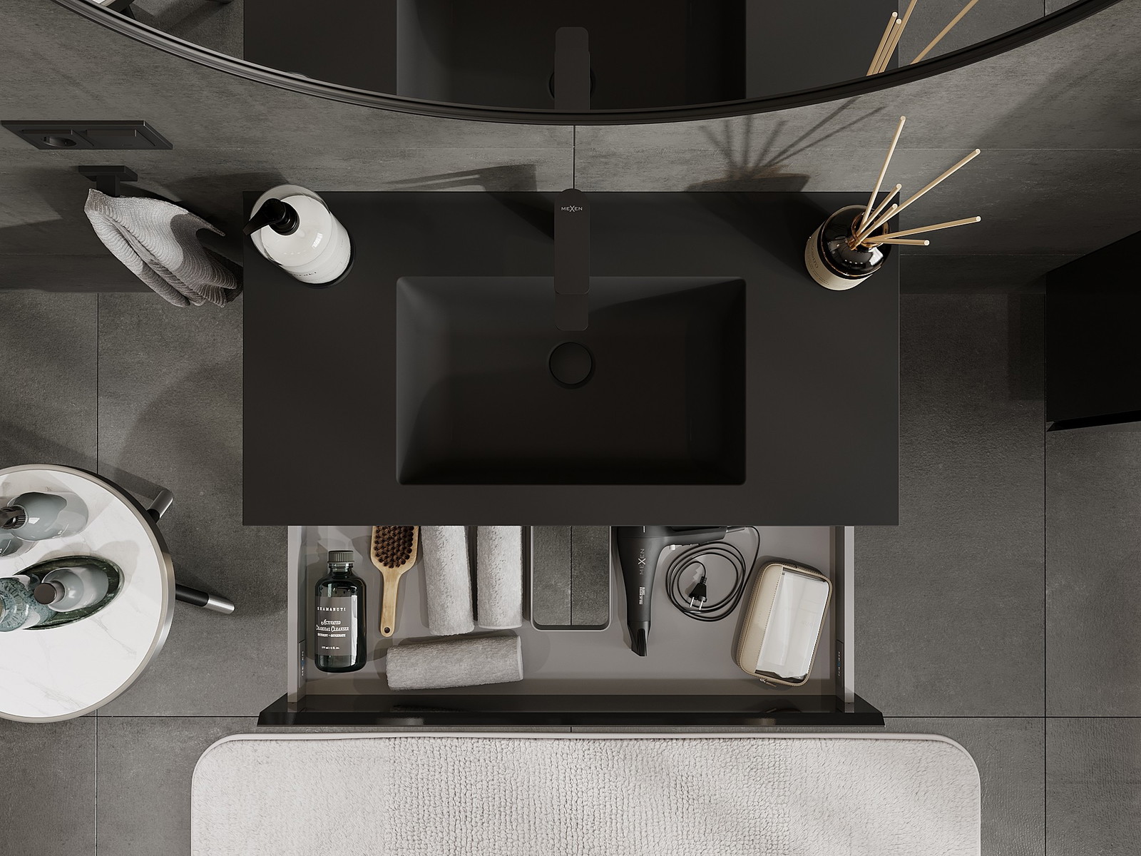 Mexen Orio kylpyhuonekaappi 90 cm altaalla Otis, 2 laatikkoa, musta kiiltävä/matta musta - 91A10-09047-2-BFF70-W18M71