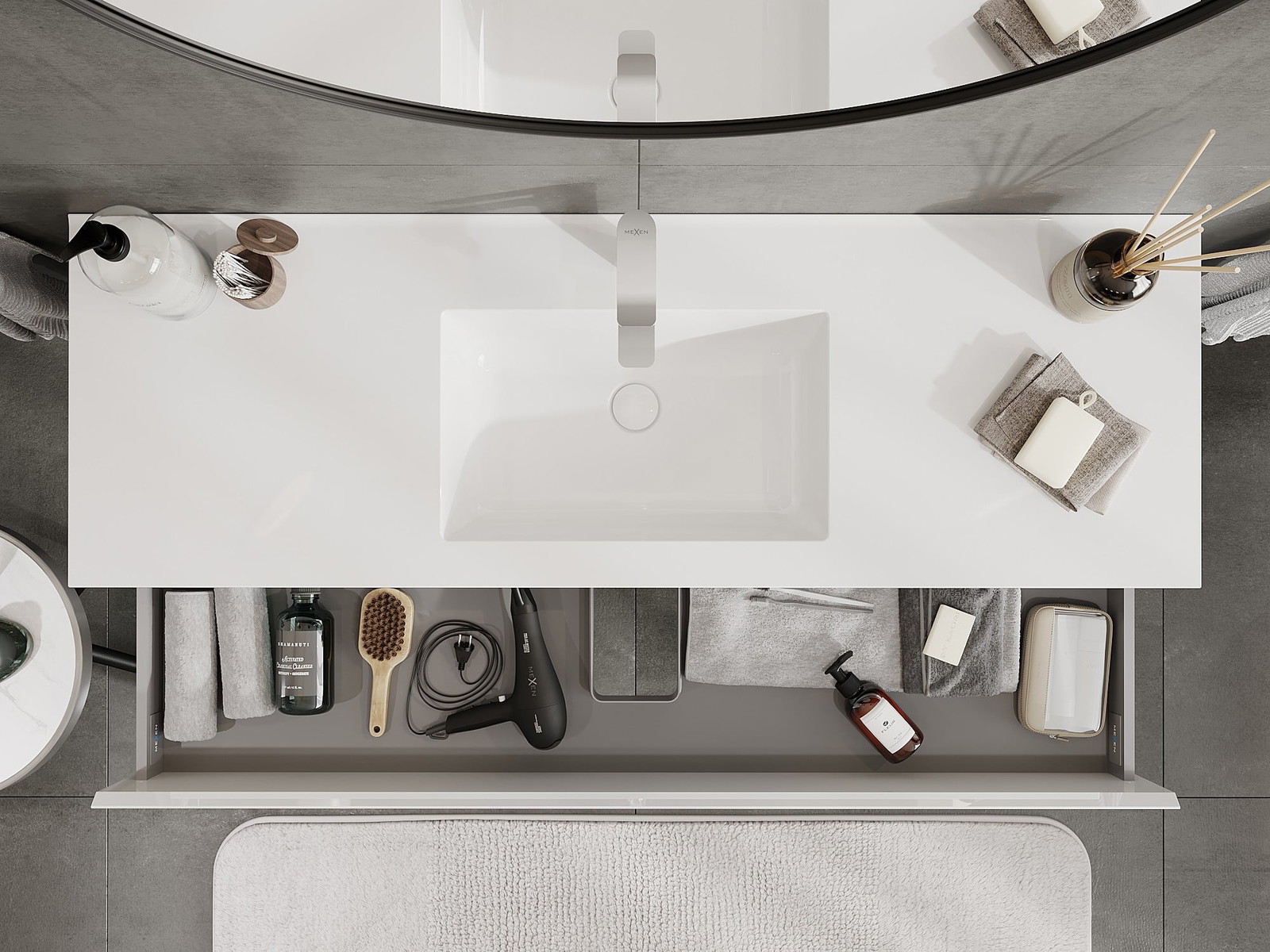 Mexen Orio 140 cm kylpyhuonekaappi pesualtaalla Otis, 2 laatikkoa, valkoinen kiiltävä - 91A10-14047-2-BFF00-W18M00