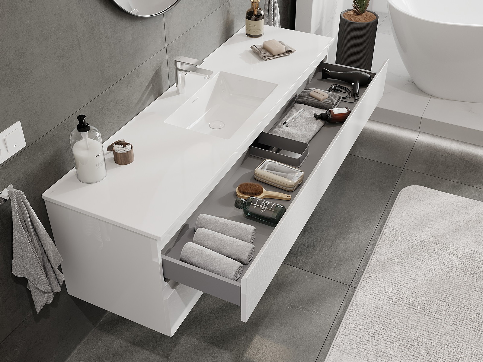 Modulaariset kylpyhuonekalusteemme voidaan yhdistää eri väriyhdistelminä, mikä mahdollistaa täydellisen personoinnin. Voit valita sekä ulkonäön että yksittäisten elementtien toiminnot, mikä mahdollistaa huonekalujen mukauttamisen omien tyylillisten ja käyttöön liittyvien mieltymysten mukaan.
