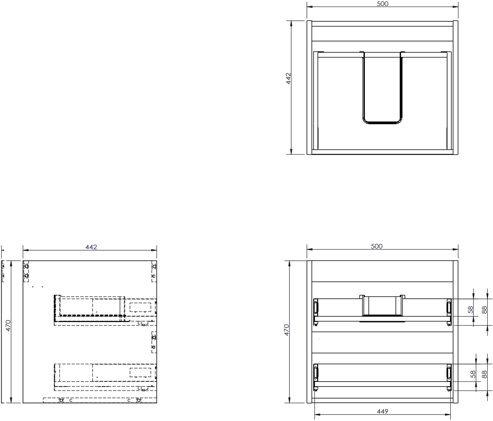 Laatikon leikkaus on suunniteltu siten, että se mahtuu vetolaitteeseen, joka on välttämätön pesuallasasennuksissa. Tämän ansiosta huonekalu voidaan asentaa täysin toimivasti, luopumatta laatikon tilasta asennusten hyväksi.