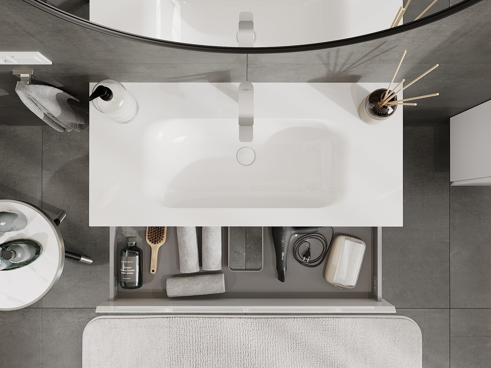 Laatikon leikkaus on suunniteltu siten, että se mahtuu vetolaitteeseen, joka on välttämätön pesuallasasennuksissa. Tämän ansiosta huonekalu voidaan asentaa täysin toimivasti, luopumatta laatikon tilasta asennusten hyväksi.