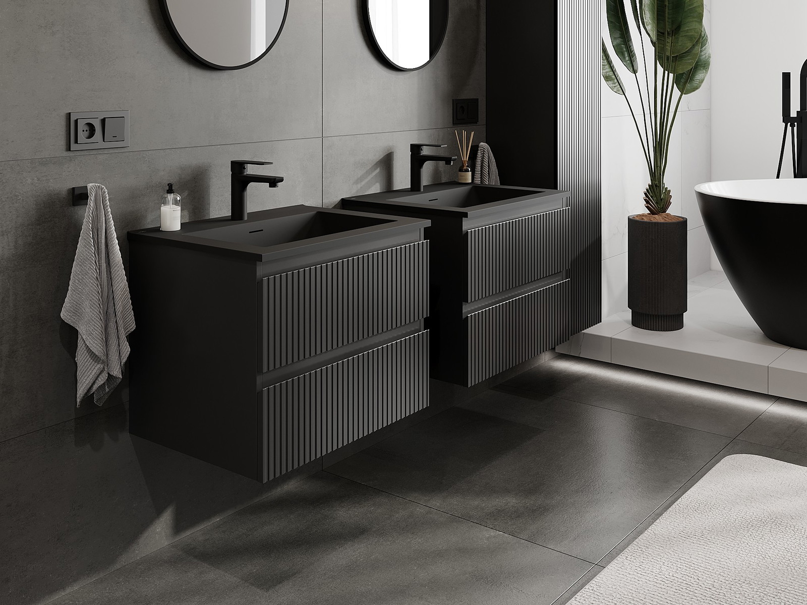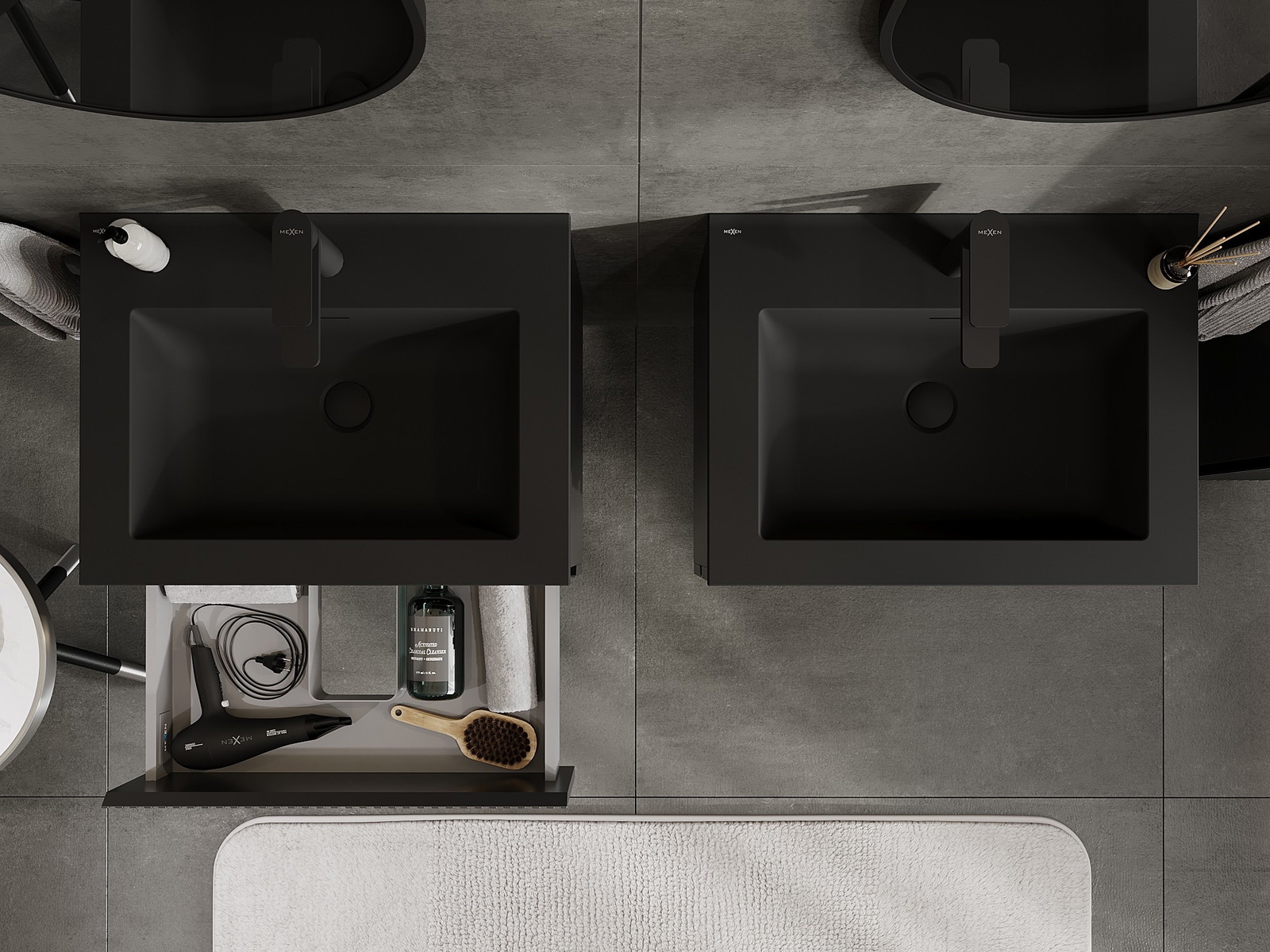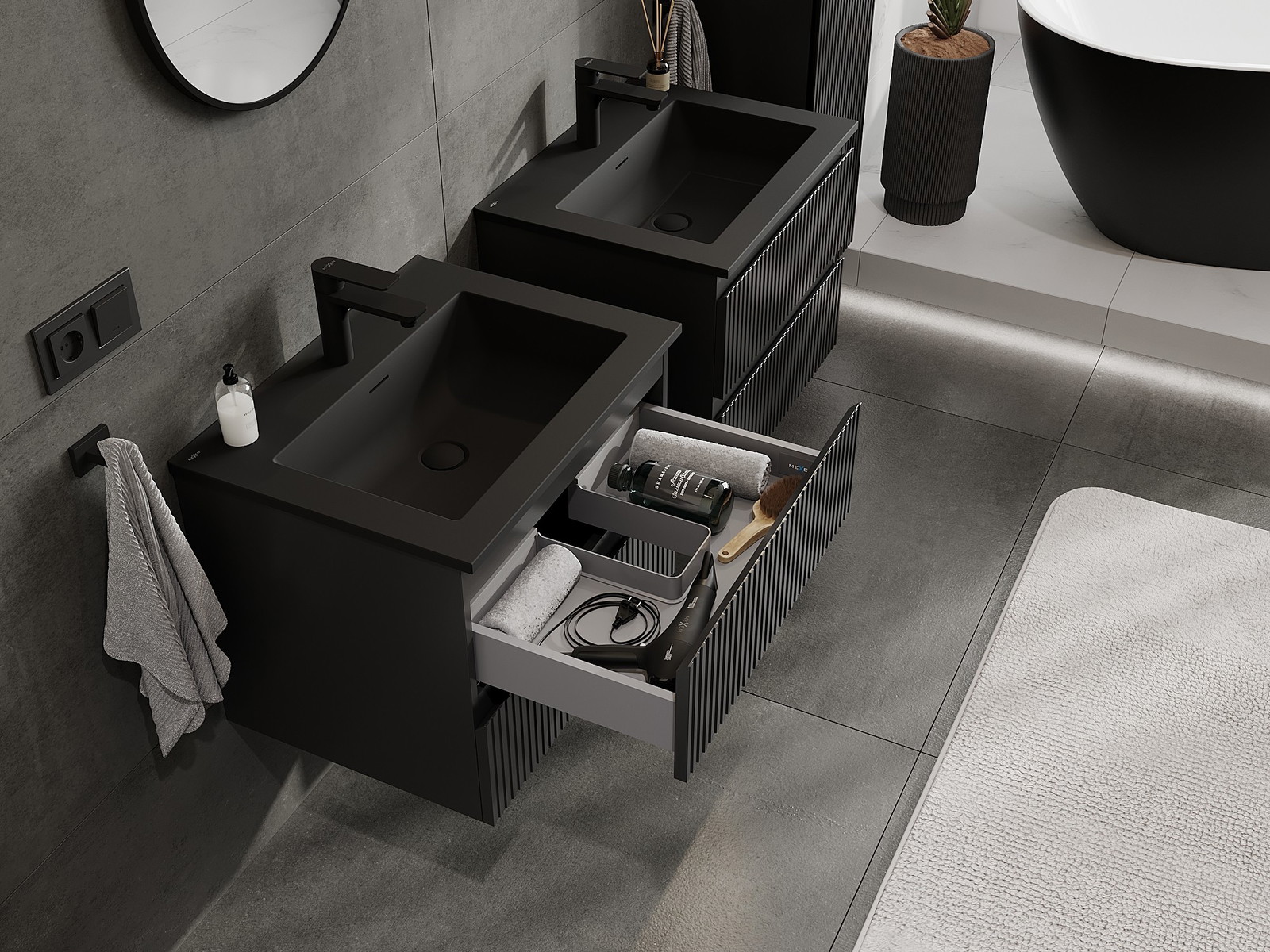 Mexen Rivel 60 cm kylpyhuonekaappi Otis, pesuallas, 2 laatikkoa, uurrettu, musta matta - 91A20-06047-2-BFF71-W18M71