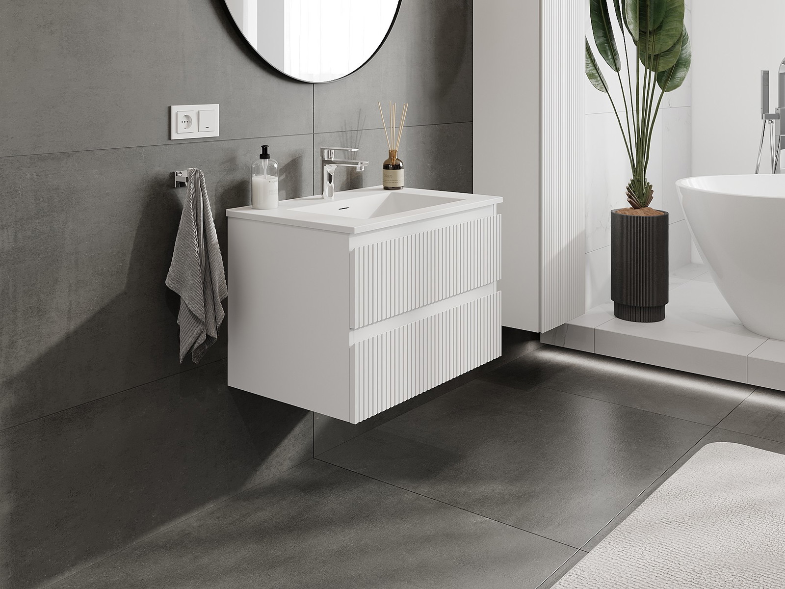 Mexen Rivel 70 cm kylpyhuonekaappi Otis-altaalla, 2 laatikkoa, uritettu, valkoinen mattapinta - 91A20-07047-2-BFF01-W18M01