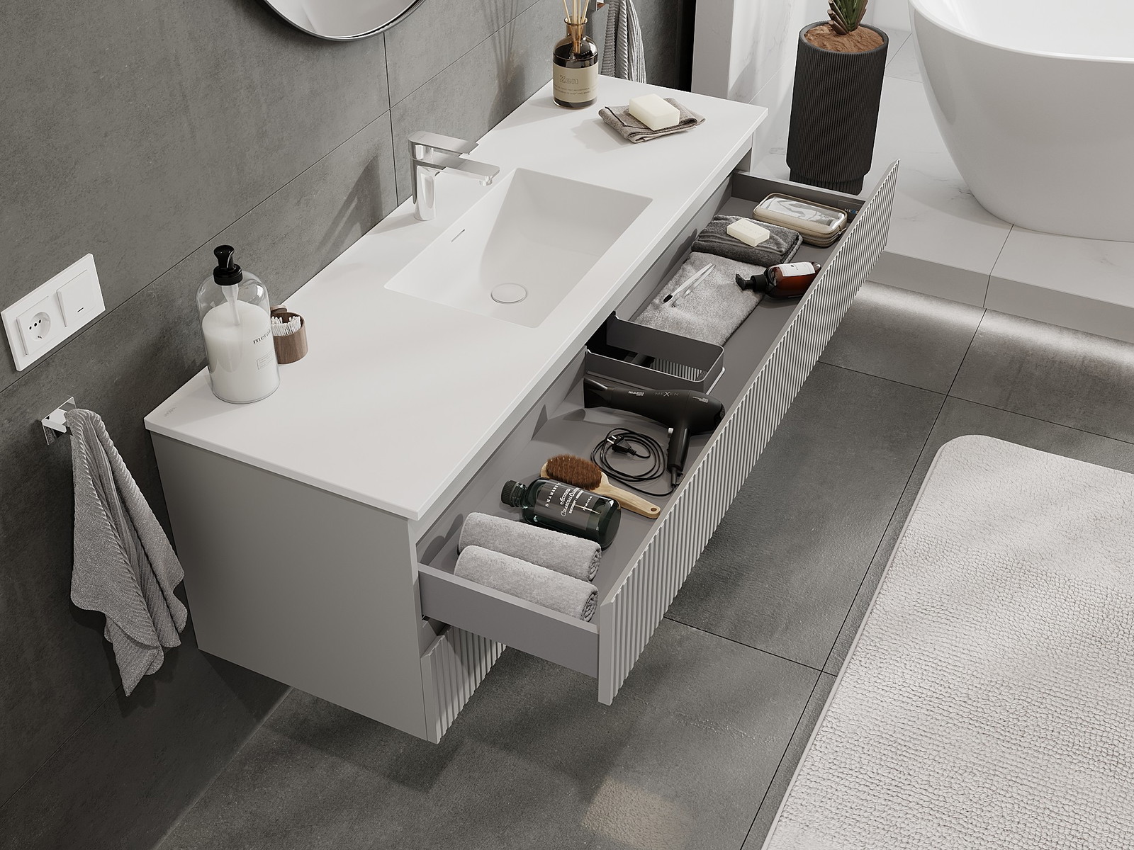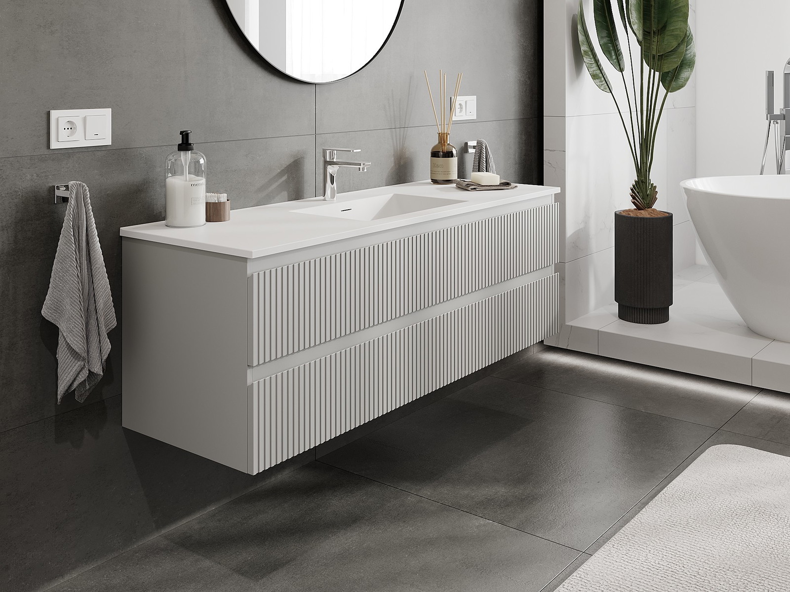 Mexen Rivel Kylpyhuonekaappi 140 cm pesualtaalla Otis, 2 laatikkoa, uritettu, harmaa matta/valkoinen matta -