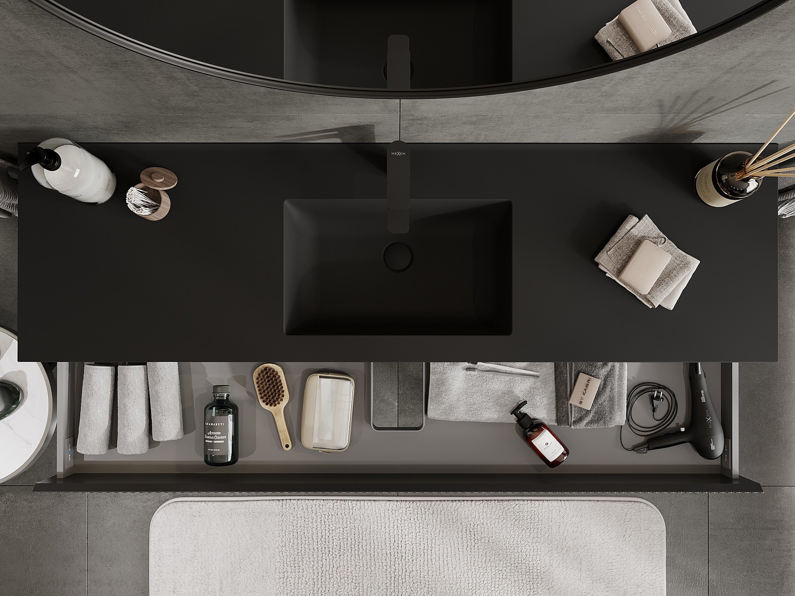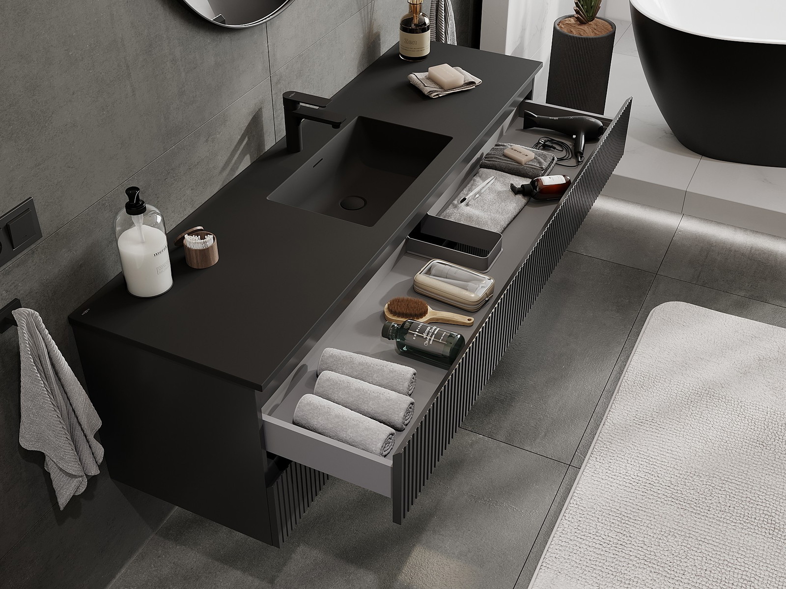 Mexen Rivel 160 cm kylpyhuonekaappi pesualtaalla Otis, 2 laatikkoa, uritettu, musta matta - 91A20-16047-2-BFF71-W18M71