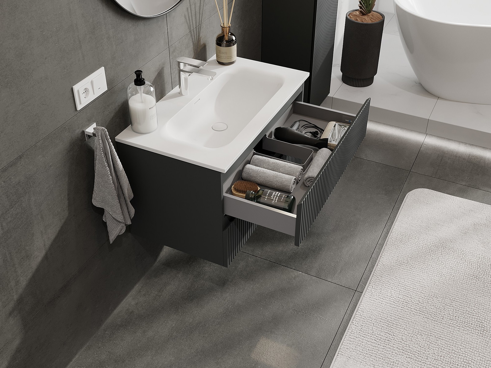 Kiinteiden materiaalien, tarkan työn ja nykyaikaisten teknologisten ratkaisujen ansiosta tuote tarjoaa käyttömukavuutta, kestävyyttä kosteutta ja lämpötilan muutoksia vastaan sekä elegantin ulkonäön, joka sopii erilaisiin kylpyhuonetyyleihin.