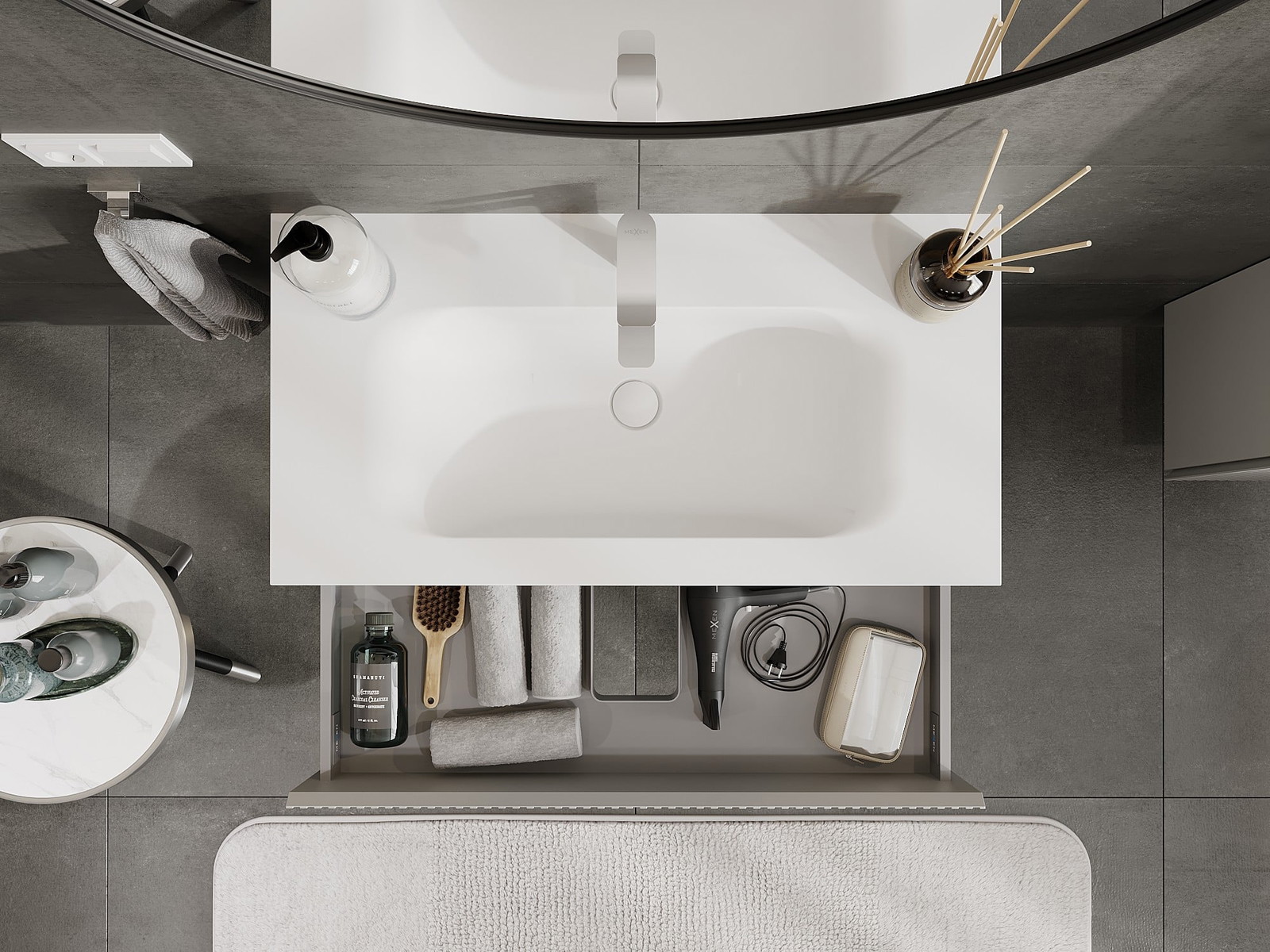 Laatikon leikkaus on suunniteltu siten, että se mahtuu vetolaitteeseen, joka on välttämätön pesuallasasennuksissa. Tämän ansiosta huonekalu voidaan asentaa täysin toimivasti, luopumatta laatikon tilasta asennusten hyväksi.