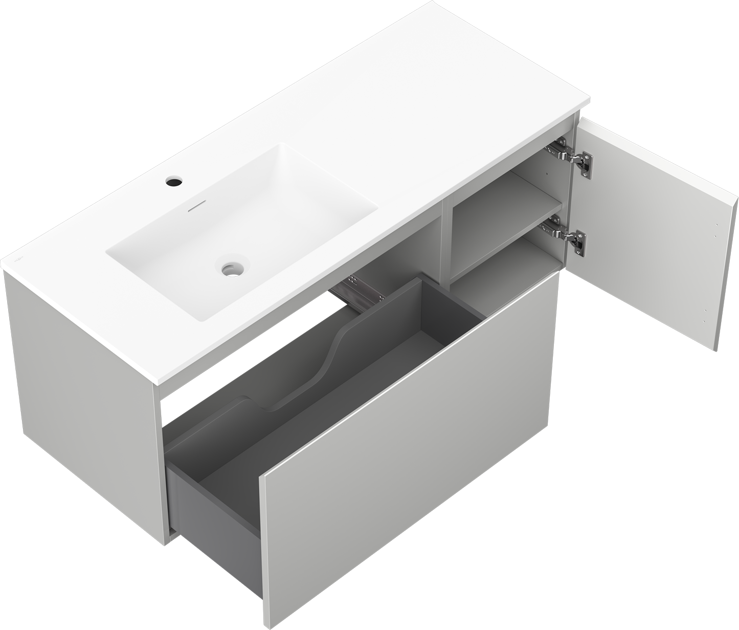 Laatikon leikkaus on suunniteltu siten, että se mahtuu vetolaitteeseen, joka on välttämätön pesuallasasennuksissa. Tämän ansiosta huonekalu voidaan asentaa täysin toimivasti, luopumatta laatikon tilasta asennusten hyväksi.