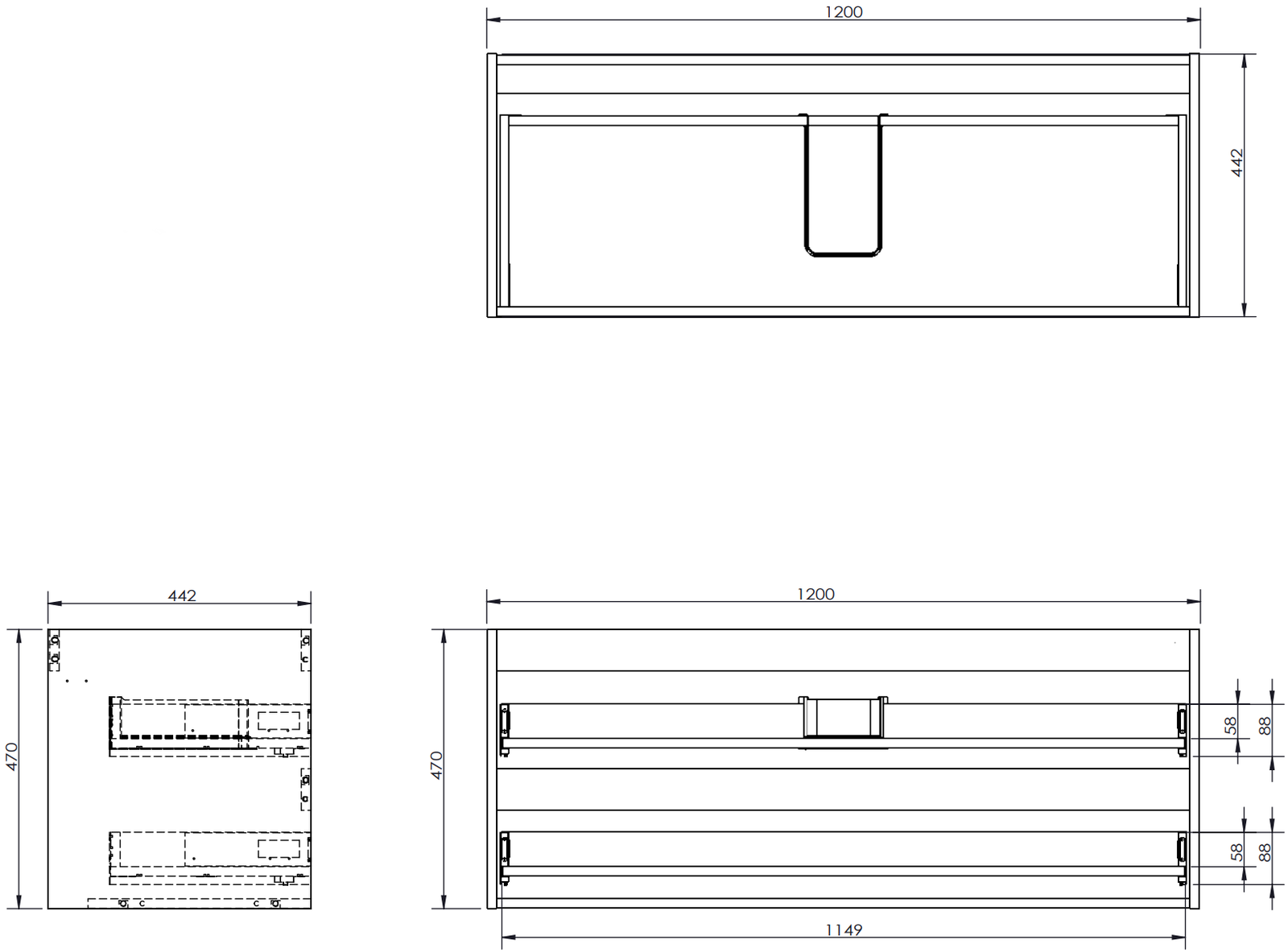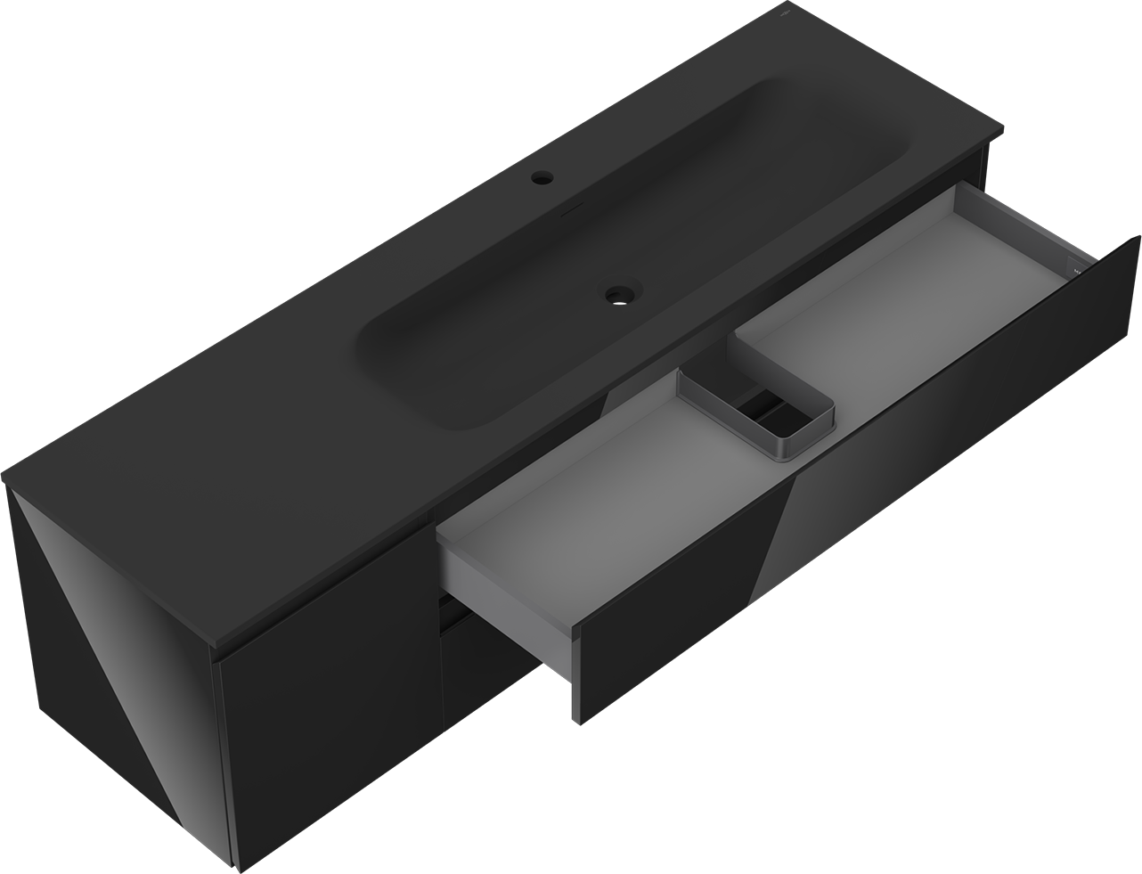 Laatikon leikkaus on suunniteltu siten, että se mahtuu vetolaitteeseen, joka on välttämätön pesuallasasennuksissa. Tämän ansiosta huonekalu voidaan asentaa täysin toimivasti, luopumatta laatikon tilasta asennusten hyväksi.