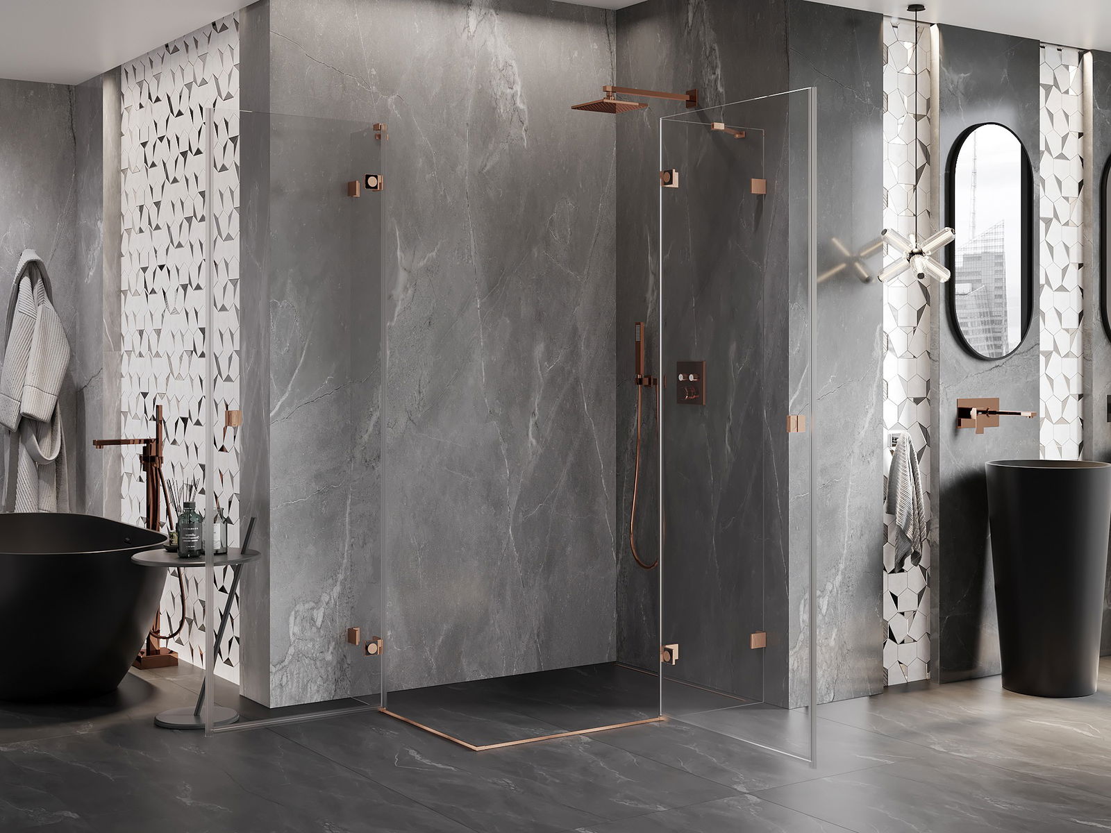 Mexen Lunar Duo kääntyvä suihkukaappi oikea 115 x 85 cm, läpinäkyvä, harjattu kupari - 834-115P-085L-65-00