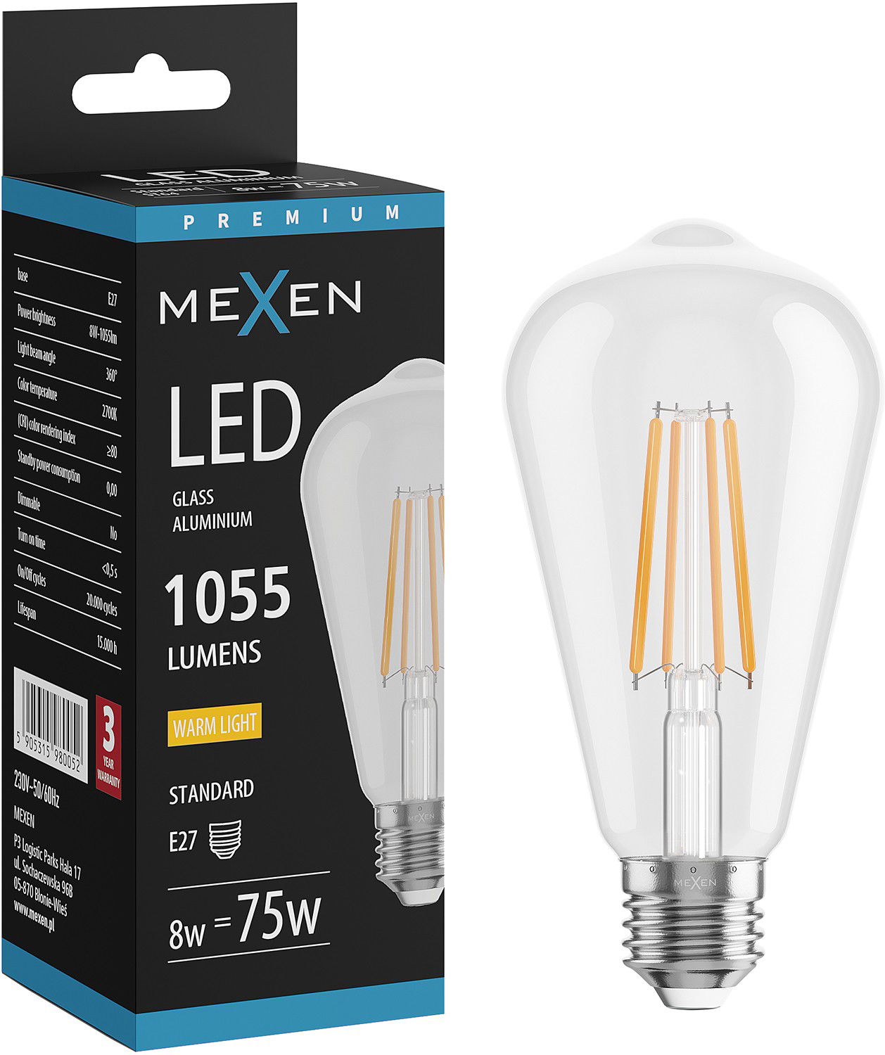 Mexen Vintis LED-filamenttilamppu E27, ST64, 8W, Lämmin - 2700K, 1055 lm, kirkas - L152-E27-0827-00