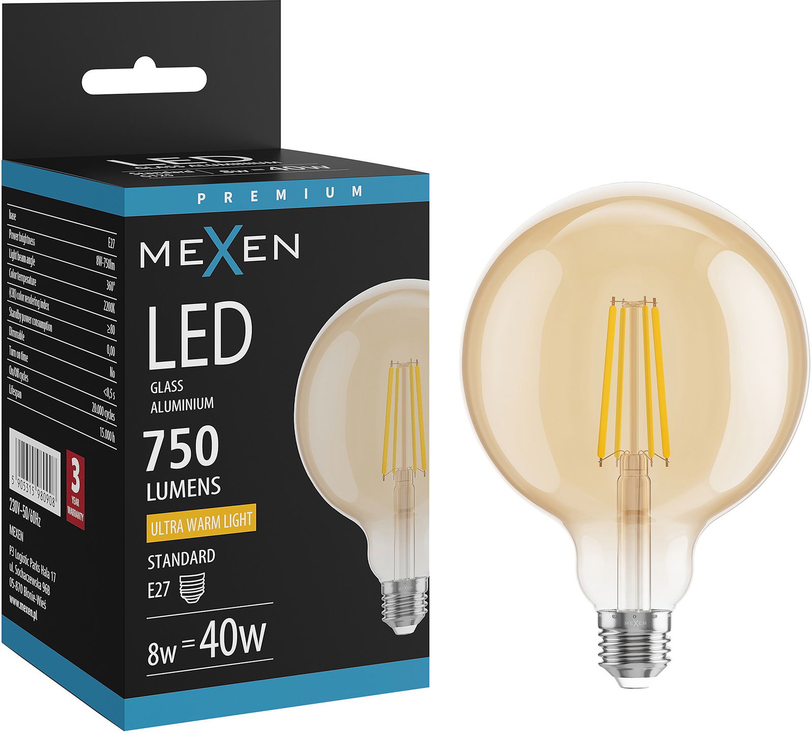 Mexen Vintis LED E27 filamenttilamppu, G125, 8W, Lämpimän - 2200K, 750 lm, meripihka - L158-E27-0822-50