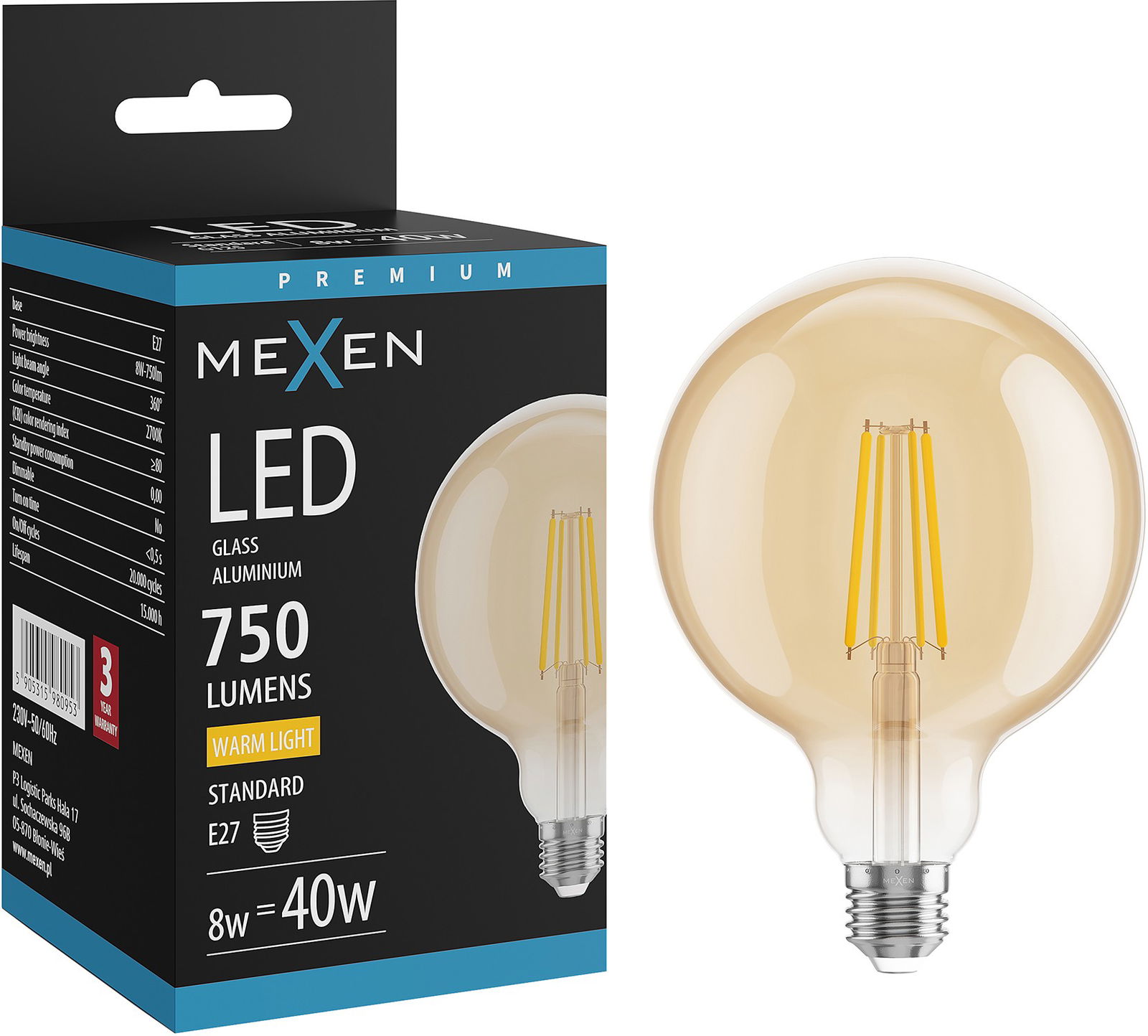 Mexen Vintis LED-filamenttilamppu E27, G125, 8W, Lämmin - 2700K, 750 lm, meripihka - L158-E27-0827-50