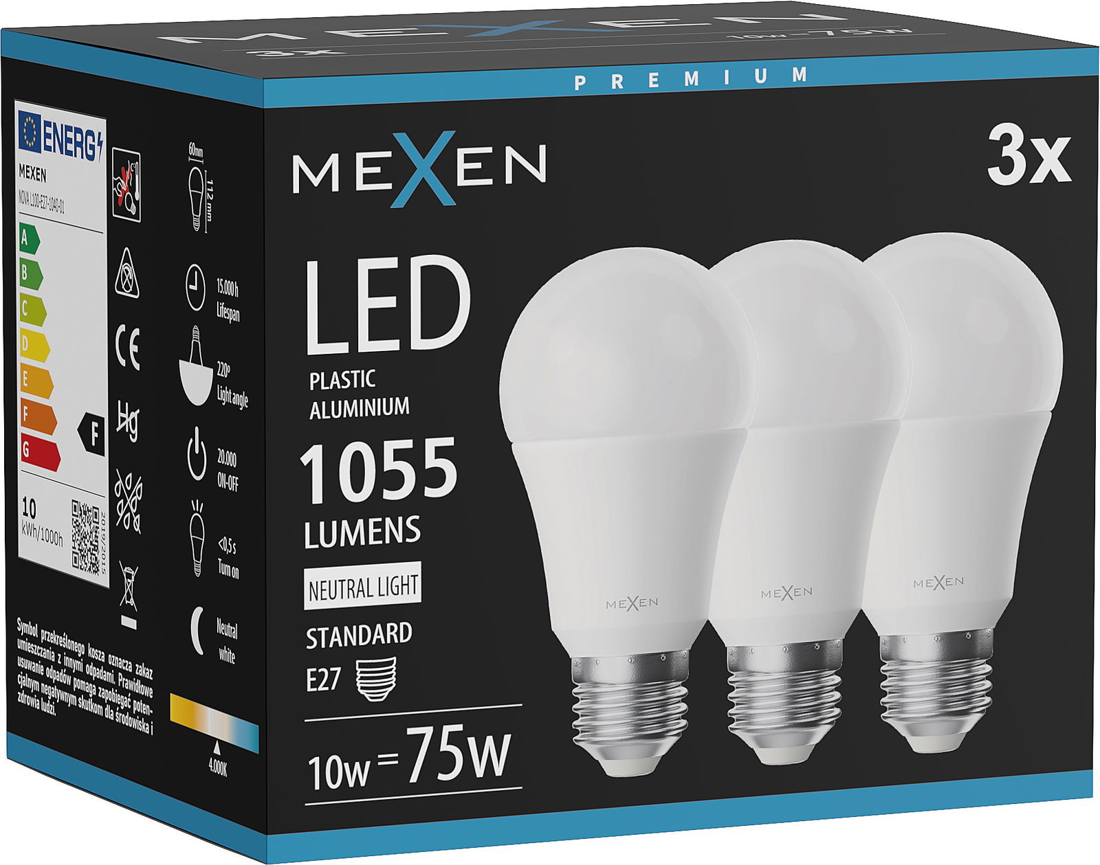 Mexen Nova 3x LED-lamppu E27, A60, 10W, Neutraali - 4000K, 1055 lm - L100-E27-1040-01x03