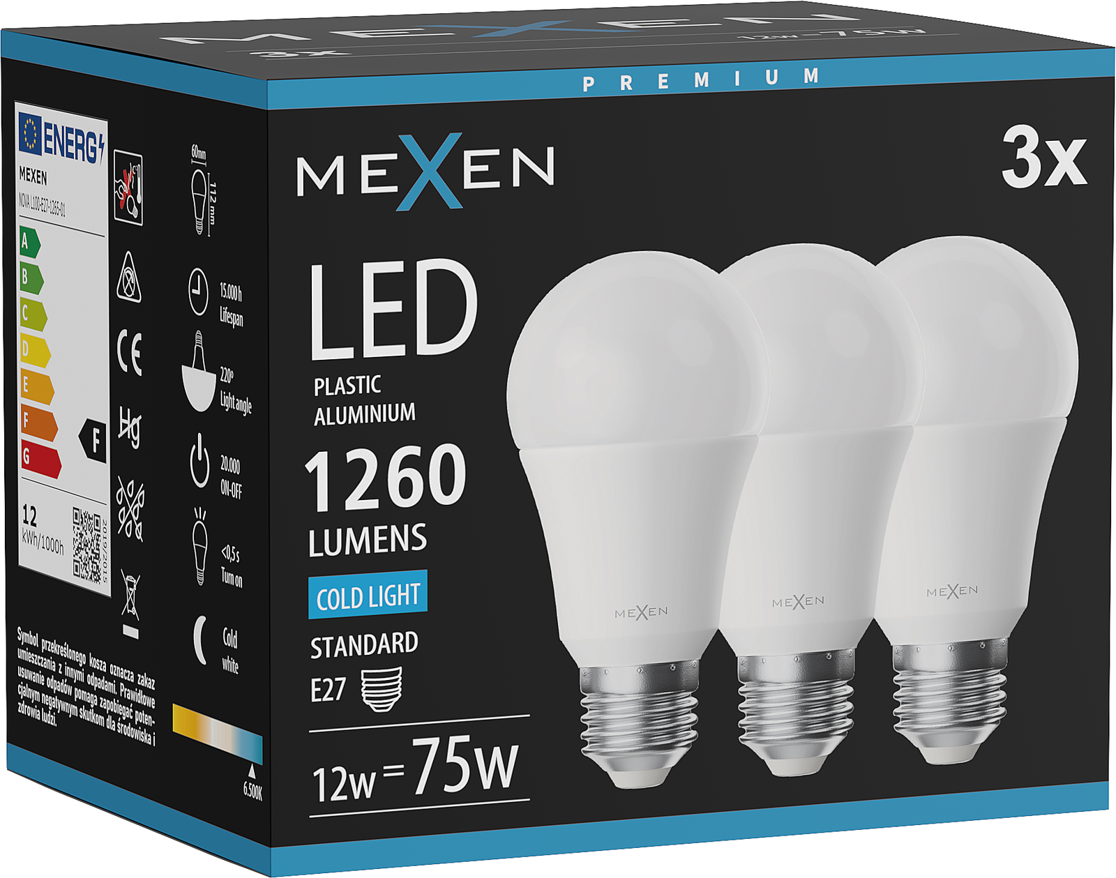 Mexen Nova 3x LED-lamppu E27, A60, 12W, Kylmä - 6500K, 1260 lm - L100-E27-1265-01x03