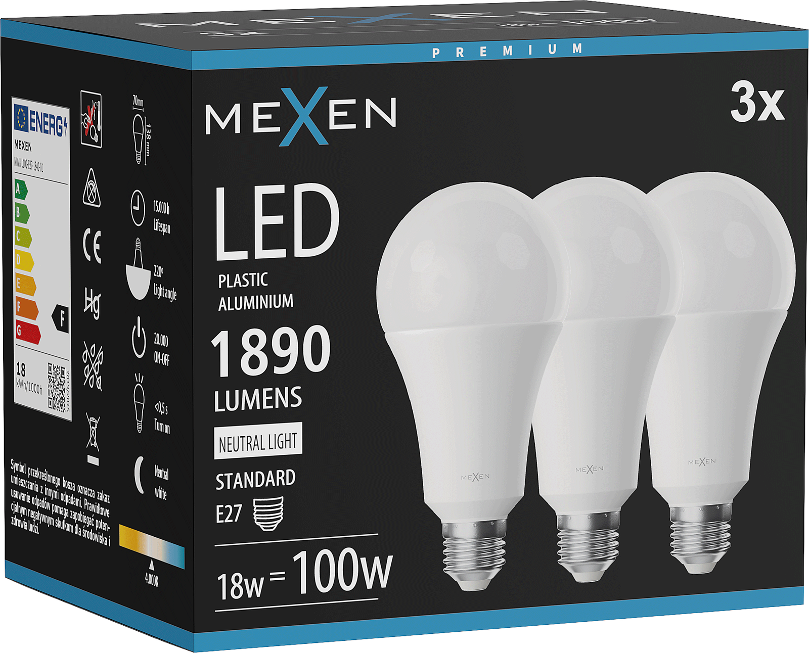 Mexen Nova 3x LED-lamppu E27, A70, 18W, Neutraali - 4000K, 1890 lm - L100-E27-1840-01x03