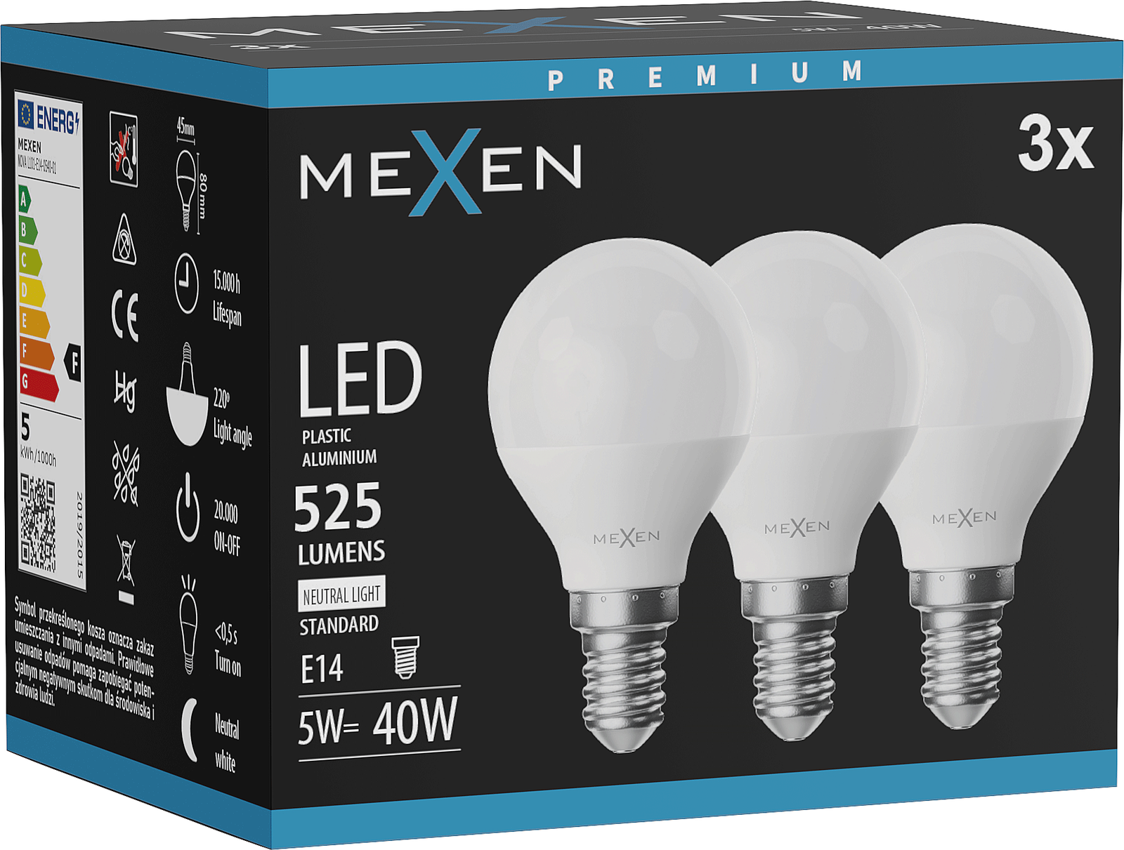 Mexen Nova 3x LED-lamppu E14, G45, 5W, Neutraali - 4000K, 525 lm - L101-E14-0540-01x03