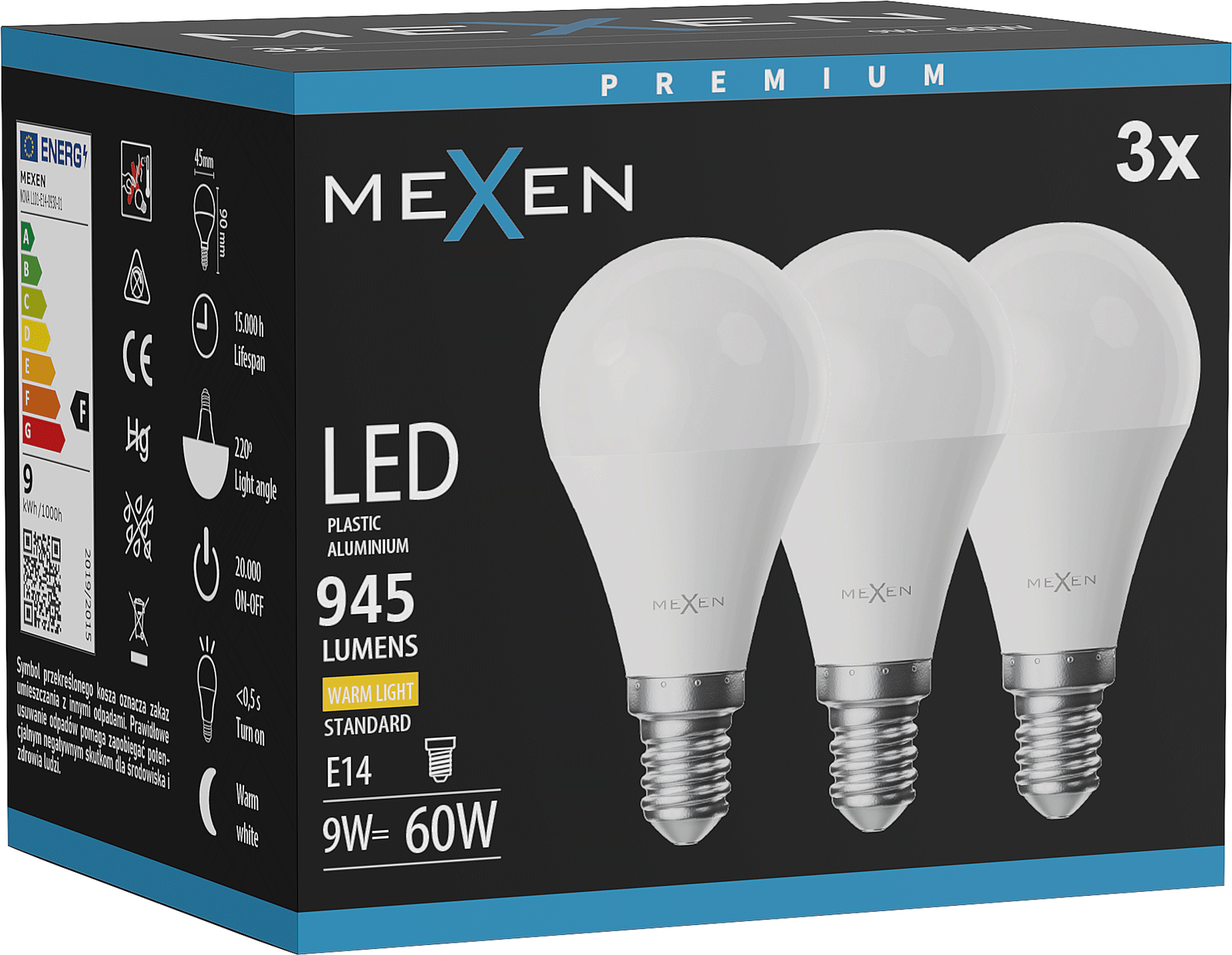Mexen Nova 3x LED-lamppu E14, G45, 9W, Lämmin - 3000K, 945 lm - L101-E14-0930-01x03