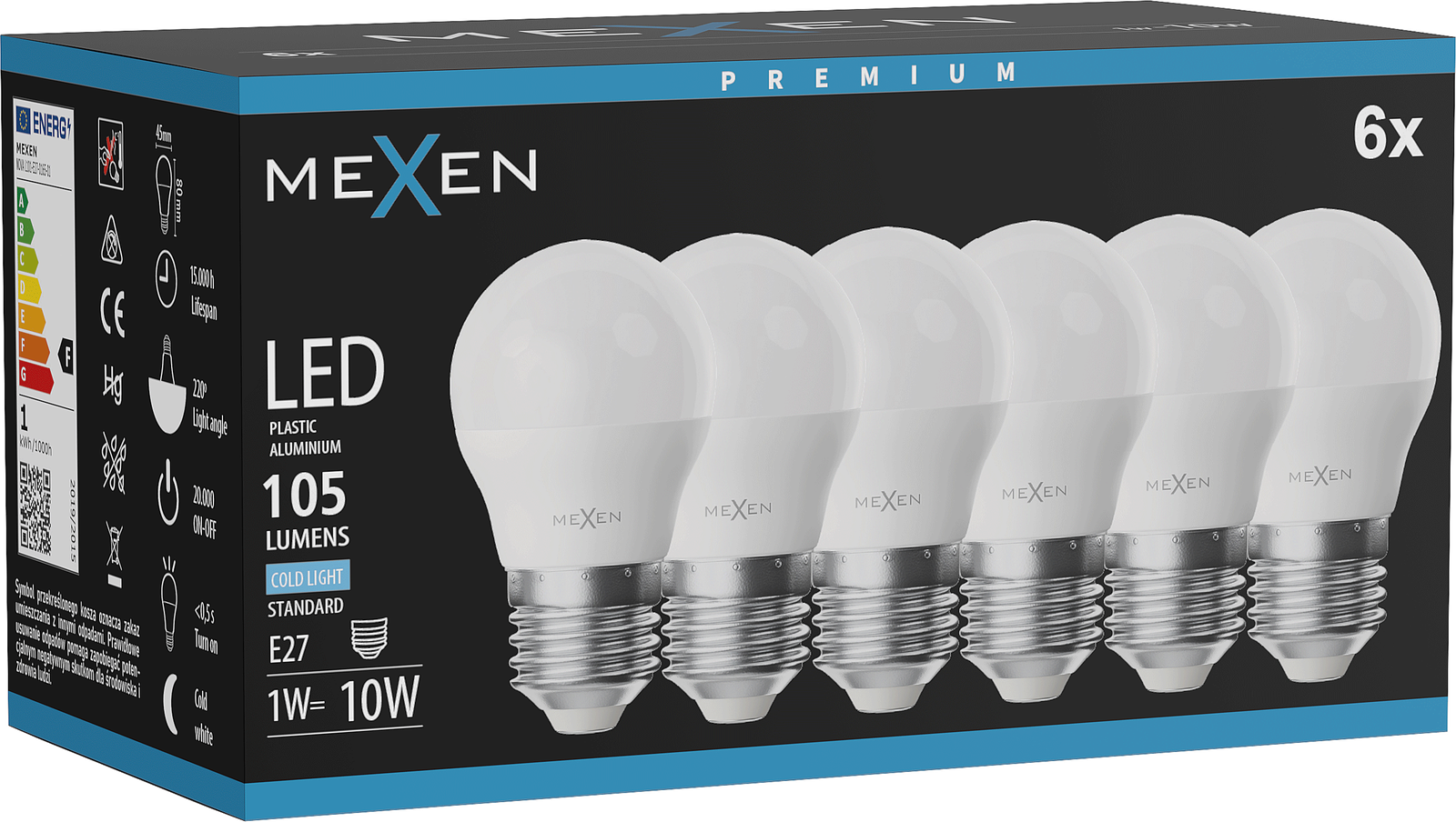 Mexen Nova 6x LED-lamppu E27, G45, 1W, Kylmä - 6500K, 105 lm - L101-E27-0165-01x06