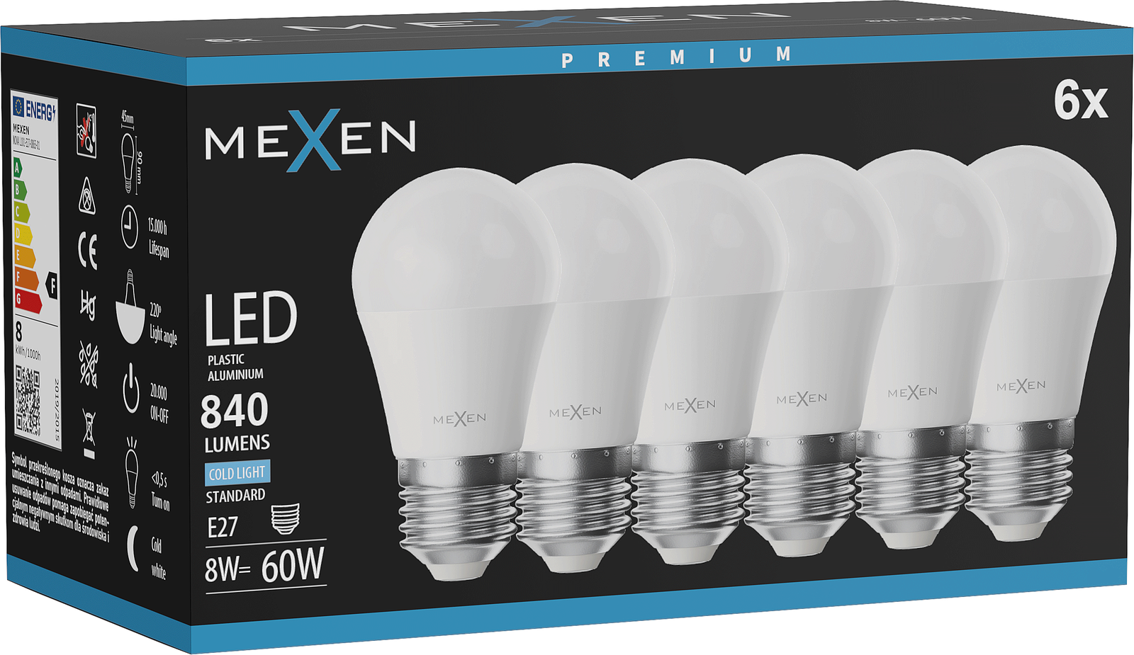 Mexen Nova 6x LED-lamppu E27, G45, 8W, Kylmä - 6500K, 840 lm - L101-E27-0865-01x06
