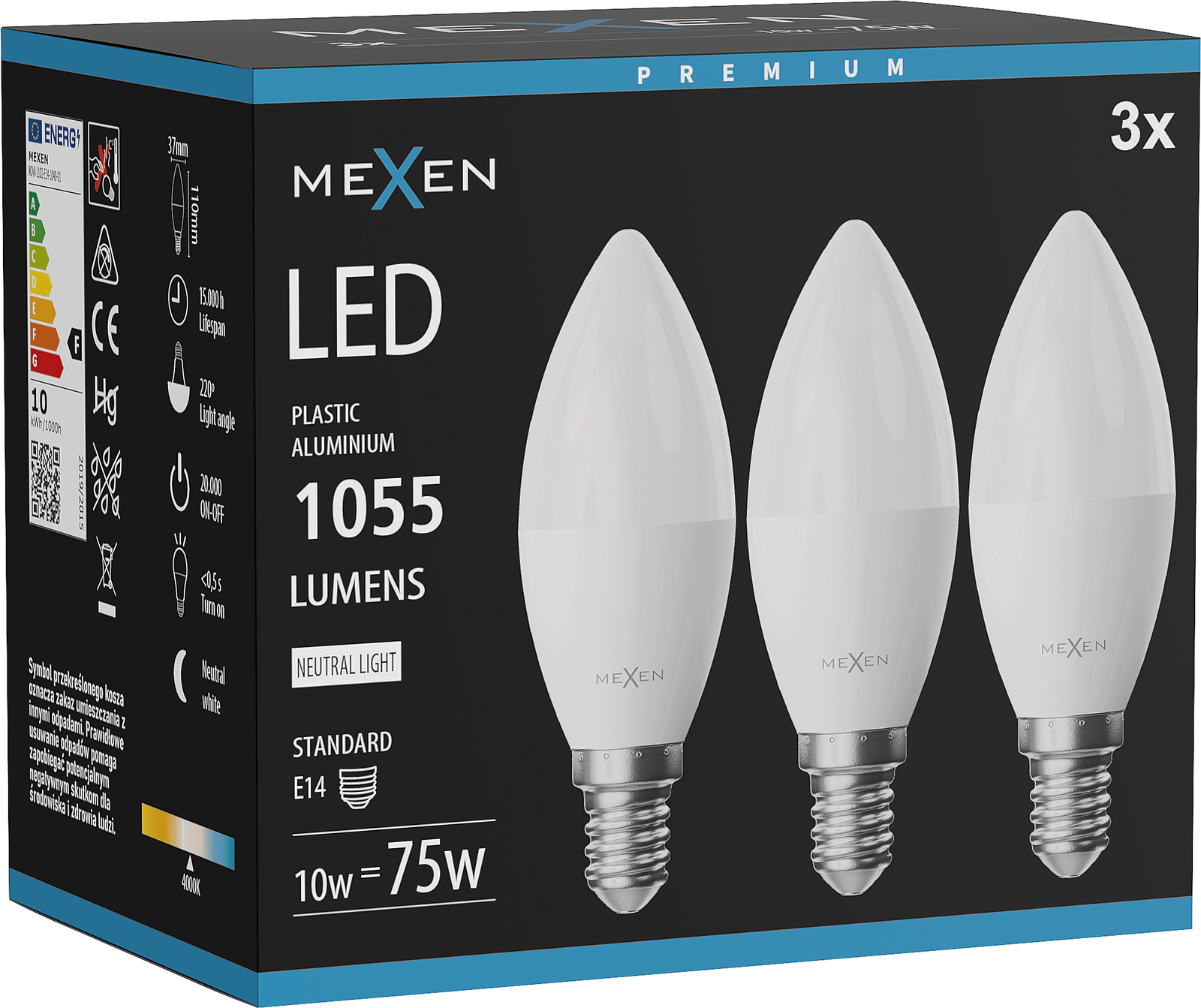 Mexen Nova 3x LED-lamppu E14, C37, 10W, Neutraali - 4000K, 1055 lm - L102-E14-1040-01x03
