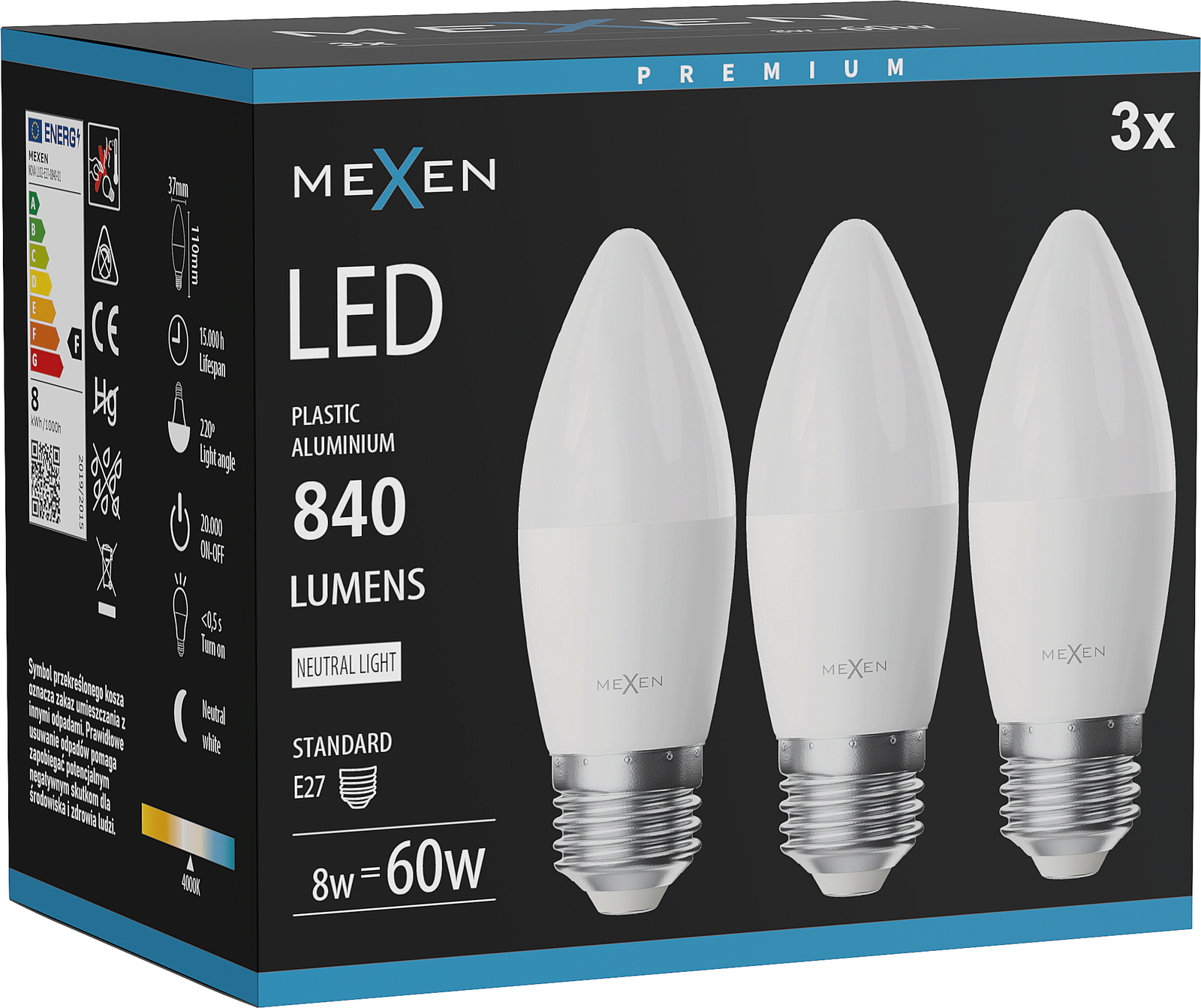 Mexen Nova 3x LED-lamppu E27, C37, 8W, Neutraali - 4000K, 840 lm - L102-E27-0840-01x03
