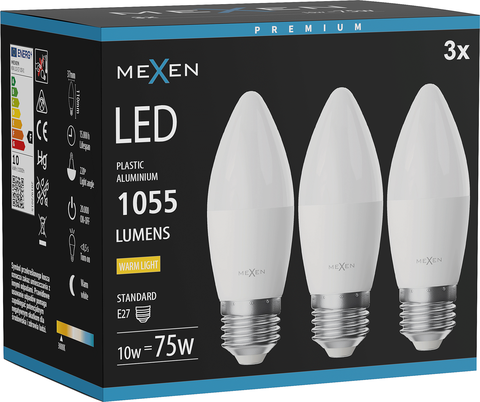 Mexen Nova 3x LED-lamppu E27, C37, 10W, Lämmin - 3000K, 1055 lm - L102-E27-1030-01x03