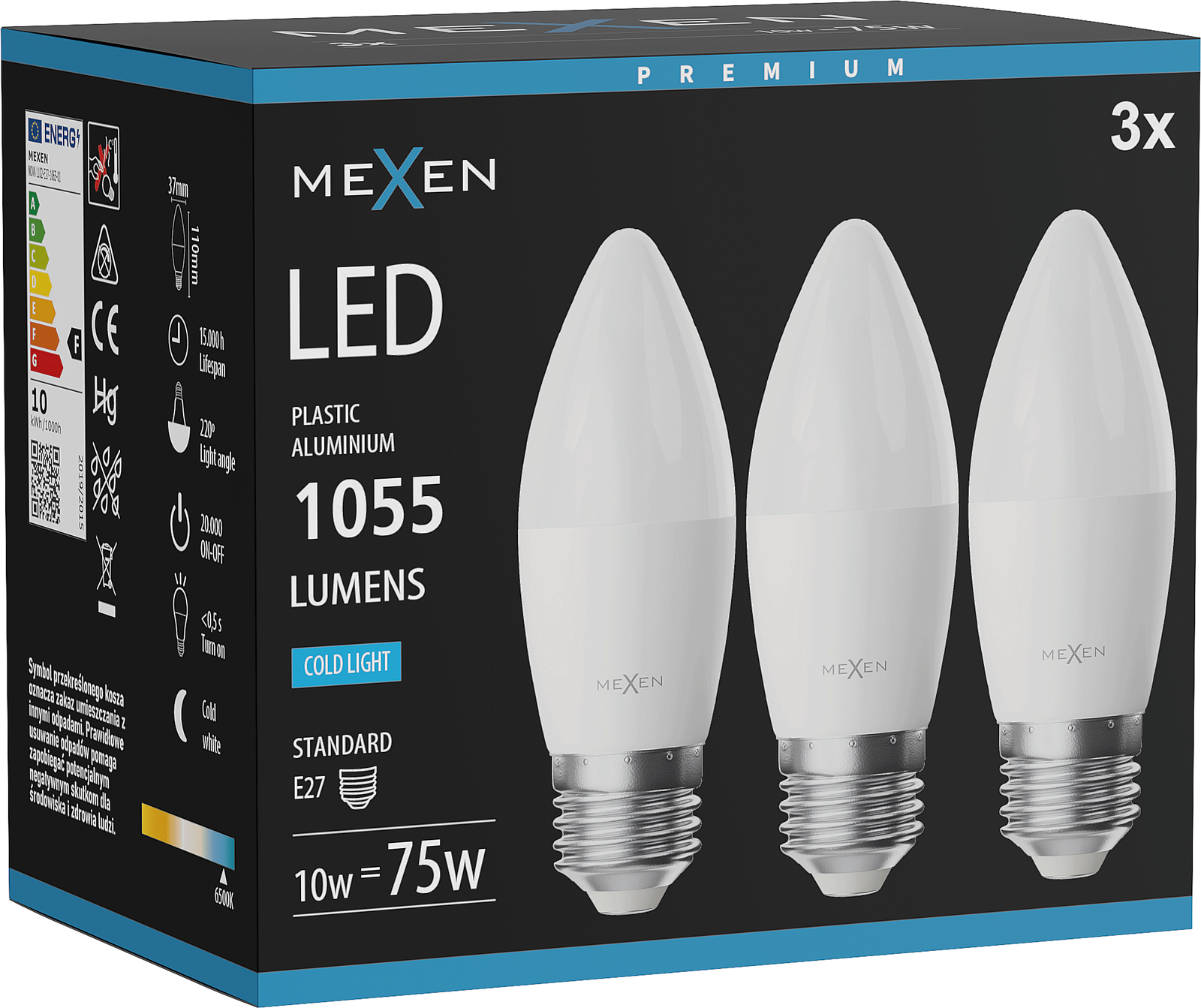 Mexen Nova 3x LED-lamppu E27, C37, 10W, Kylmä - 6500K, 1055 lm - L102-E27-1065-01x03
