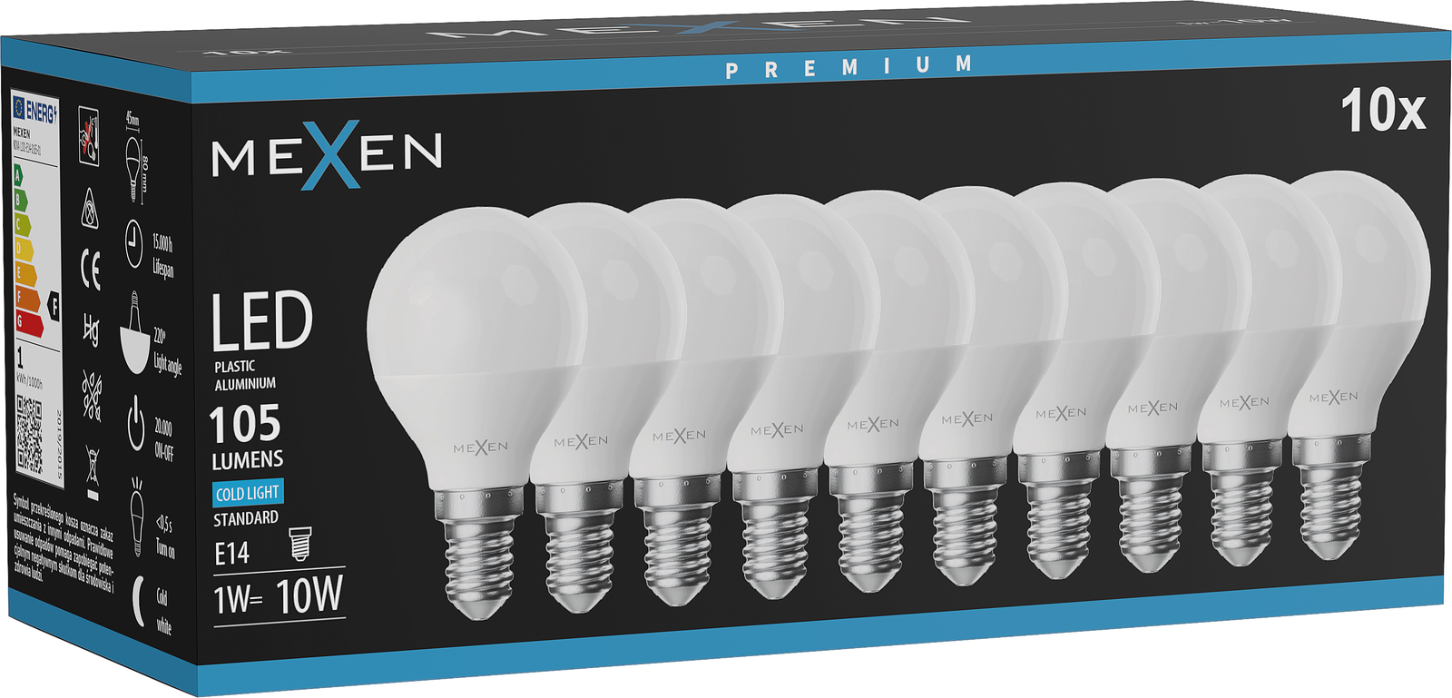 Mexen Nova 10x LED-lamppu E14, G45, 1W, Kylmä - 6500K, 105 lm - L101-E14-0165-01x10