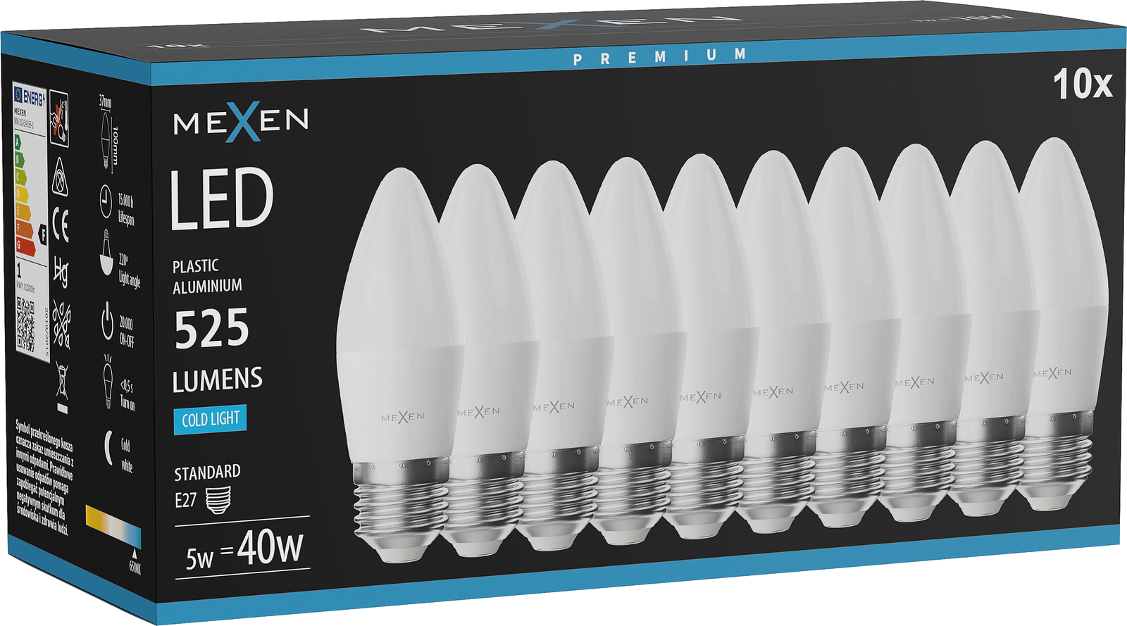 Mexen Nova 10x LED-lamppu E27, C37, 5W, Kylmä - 6500K, 525 lm - L102-E27-0565-01x10