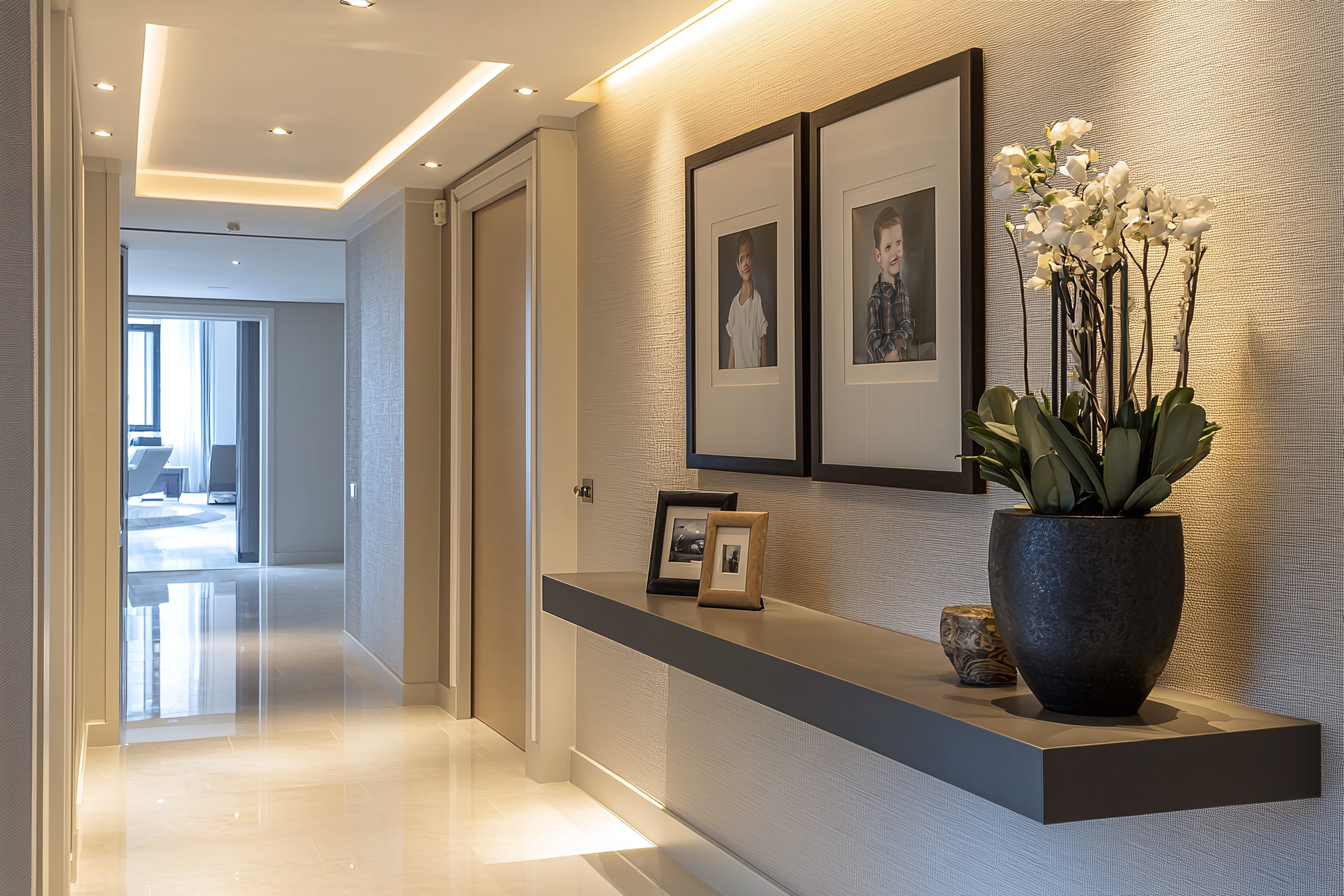 - Ikkunan esiintyminen — monessa käytävässä ei ole pääsyä luonnonvaloon. Siksi keinotekoinen valaistus on niin tärkeää. On tärkeää, että se valaisee oikein koko kulkuväylän, lähellä olevat vaatekaapit, peilit ja naulakot. Jos tilaan pääsee valoa ikkunoista, voi valita täydentävän valaistuksen, kuten seinävalaisimet.